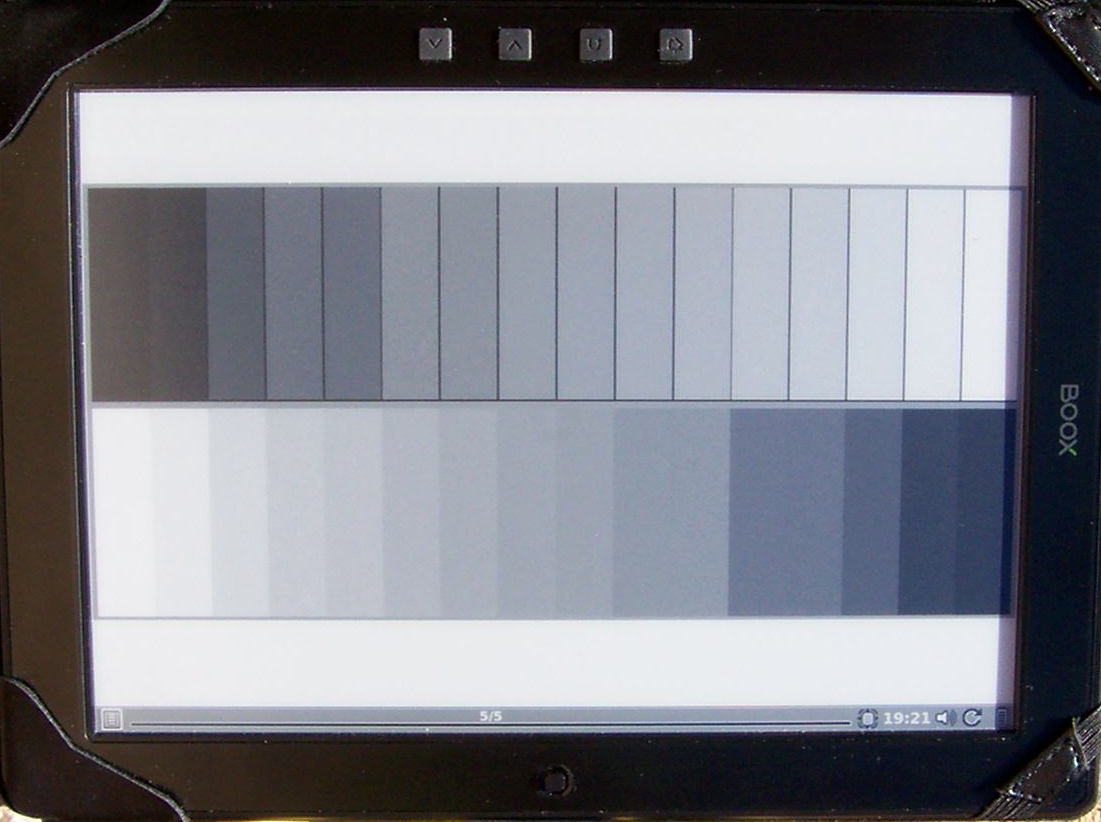 It was possible to load to device a new curve. I am not sure if it was M92 or other Onyx product. Generaly. It seems it is possible somehow to change the translation table (callibration curve). It is hard to say, if the behaviour, you discovered is intentional or it is sort of bug in table. In the case discussed at forum, there was by mistake in some readers wrong callibration curve and support helped the user to change it to right one. Only Onyx could tell us, if this is a desired feature (making reading text easier) or some kind of mistake. It is not an real issue for me, if I haven't noticed it untill now. EDIT. It looks like the output has only 14 shades, not 16 shades of display... Last edited by Mono; 08-28-2012 at 02:51 PM. |