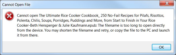 It seems what they all have in common is the file name is too long, see attached. I can see every book that causes this error in Windows explorer fine, but they will not open via Windows because the file name is too long. Android though has no problem opening them. Most of them are books with multiple authors. Calibre Companion handles them fine but Calibre doesn't recognize the books with a check in the OnDevice column as being in the library and on the device. This is not a problem for me but I wanted to point out the situation to you. Quote: