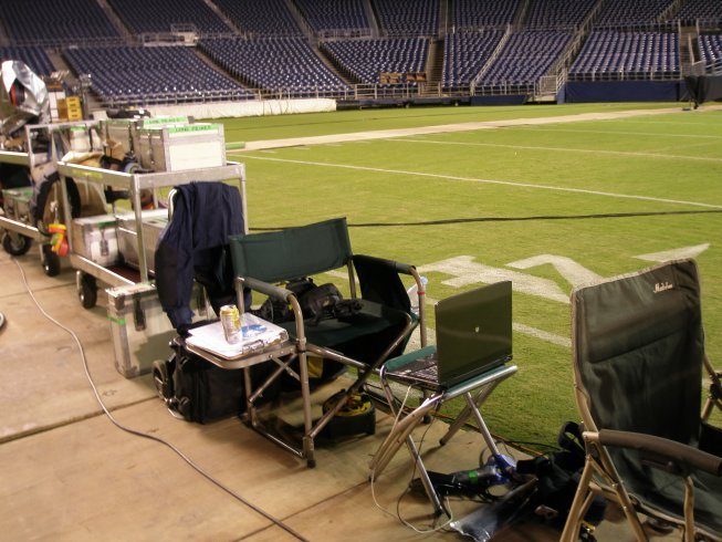 I have what I like to call a "mobile office". I'm totally self contained and carry everything I need except for a few things... power (though sometimes that block battery has to come out) and a video feed (which I get from the appropriate person).