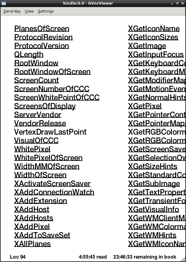 The licensing seems permissive of this effort. As I say: prefer to read this stuff offline so. meh. sharing. The index is a bit of a fudge but seems usable. Re the index: Some entries do still leach off to one side in the secondary index. "Xlib programming manual: function index" Feel free to fix it. I search the stuff I want so this doesn't matter to me so much. It's all still "clickable". I use huge fonts, it works better in smaller fonts if you really want to use the index kindle:0.0 - GVncViewer_114.png = pictured big fonts running off right hand side. meh. Re credits: Huge thanks to Baf and Christophe Tronche for making me aware of this and providing this. Last edited by twobob; 10-08-2012 at 12:33 PM. Reason: layout |