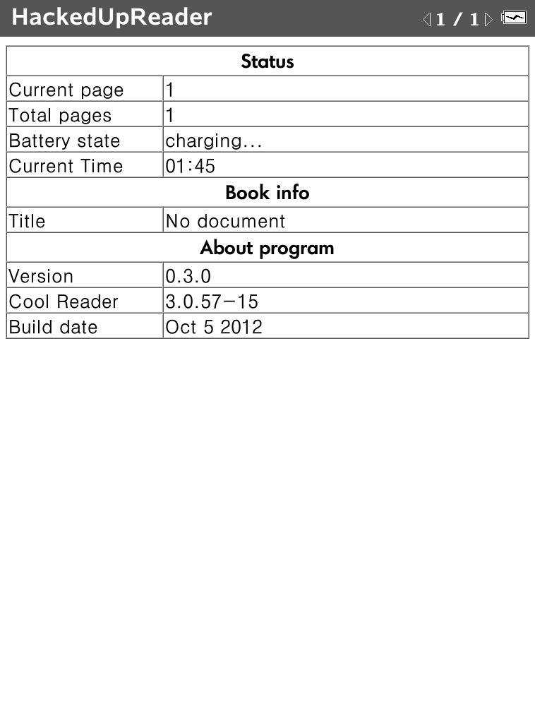 [root@kindle root]# cd /mnt/us [root@kindle us]# /mnt/us/hackedupreader/bin/cr3 2012/10/07 00:08:35.9713 ERROR Error opening file /mnt/us/hackedupreader/crlog.ini for reading 2012/10/07 00:08:35.9769 WARN Started logging. Level=INFO 49 fonts loaded. Created image depth=8 bpp=8 stride=760 Created screen 758 x 1024, depth = 8 _read_int_file(/sys/devices/platform/fsl-usb2-udc/charging): No such file or directory Do I need to check anything else? Thanks guys! You rock!