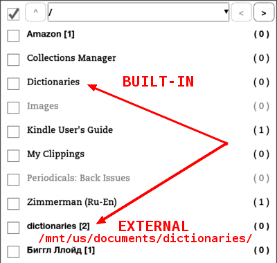 I confirm written NiLuJe about the Paperwhite. + It's necessary to exclude processing of external dictionaries folder: /mnt/us/documents/dictionaries/ Folder contents automatically joins to built-in collection "Dictionaries". Last edited by kaznelson; 10-25-2012 at 04:04 AM. |