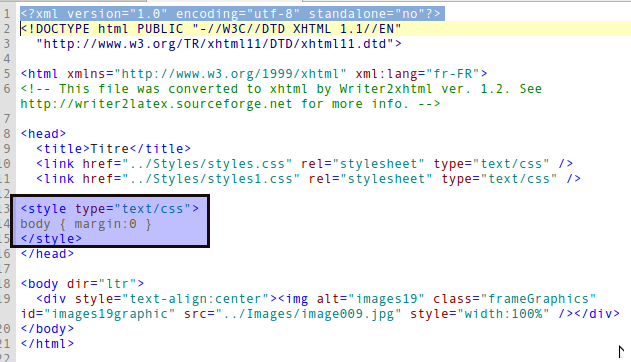 Édition Gloriette, un roman de Richard O'Monroy (Paris - 1905) Une édition PDF aux formats 9x12 cm et 9,7 pouces a également été publiée. Avec ce roman prend fin la publication sur MobileRead des ouvrages de Richard O'Monroy numérisés par Gallica. Il s'agit au total de quarante-quatre titres (quarante-deux recueils de nouvelles, une chronique théâtrale et un roman). Le recueil "Le club des braconniers" n'a pu être transcrit pour des raisons techniques. J'ai prévu de publier les titres de Richard O'Monroy de façon groupée en plusieurs éditions (4, 5, 6?). Ceci pourrait être fait au cours des prochains mois. J'ai joint à ce dernier livre son odt source. La feuille de style de l'EPUB a été aussi un peu toilettée pour la rendre plus lisible sans que cela change quoi que ce soit à la qualité de l'EPUB. Images pleine page avec Sigil Il peut arriver que vous souhaitiez mettre une ou plusieurs images en pleine page, sans même les marges utilisées pour le texte. C'est remarquablement rapide avec Sigil 0.6 : Il faut pour cela mettre cette image dans un chapitre séparé puis rajouter un petit code. 1. Rechercher votre image dans l'EPUB avec Sigil en vue Code. Une fois trouvée, insérez un marqueur au-dessus et en-dessous de l'image (Insert Split Marker). Enregistrez. Répétez ceci autant de fois que vous avez d'images pleine page. 2. Divisez votre EPUB en appuyant -une seule fois- sur Edit Split Marker. Sigil va créer de nouveaux chapitres. Vos images seront isolées dans leur propre chapitre. 3. Renommer vos chapitres (clic droit Rename). Facultatif (c'est plus joli). 4. Pour chaque nouveau chapitre contenant une image destinée à être en pleine page insérez ce bout de code, juste sous la mention des feuilles de style (voir copie d'écran). Sauvegardez, vous y êtes. Code: