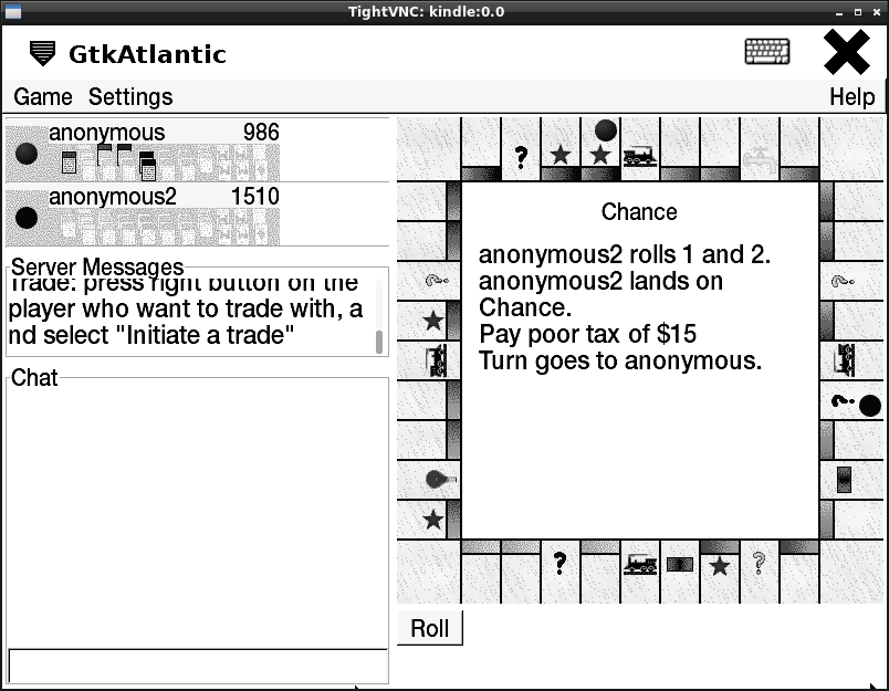 but is is actually usable. to mortgage a property (right click / middle click?) you touch the property and then click "elsewhere" - the first location appears to be chosen as "point of click" - which makes sense. I am thinking about a toolbar widget that lets you set a modmap -e "pointer 1 3 2" / modmap -e "pointer 1 2 3" switch or something so that right / middle click can be adjusted mid play. (or something) but yeah. got it running. we played a game beginning to end. was a tiny bit fiddly mortgaging until we got the hang of the double finger clicking. then it was all good! with chat! : ) EDIT: It didn't matter that the colours were indistinguishable as the engine monitored all possible moves anyways. Last edited by twobob; 11-17-2012 at 12:03 PM. Reason: maybe found the cause |