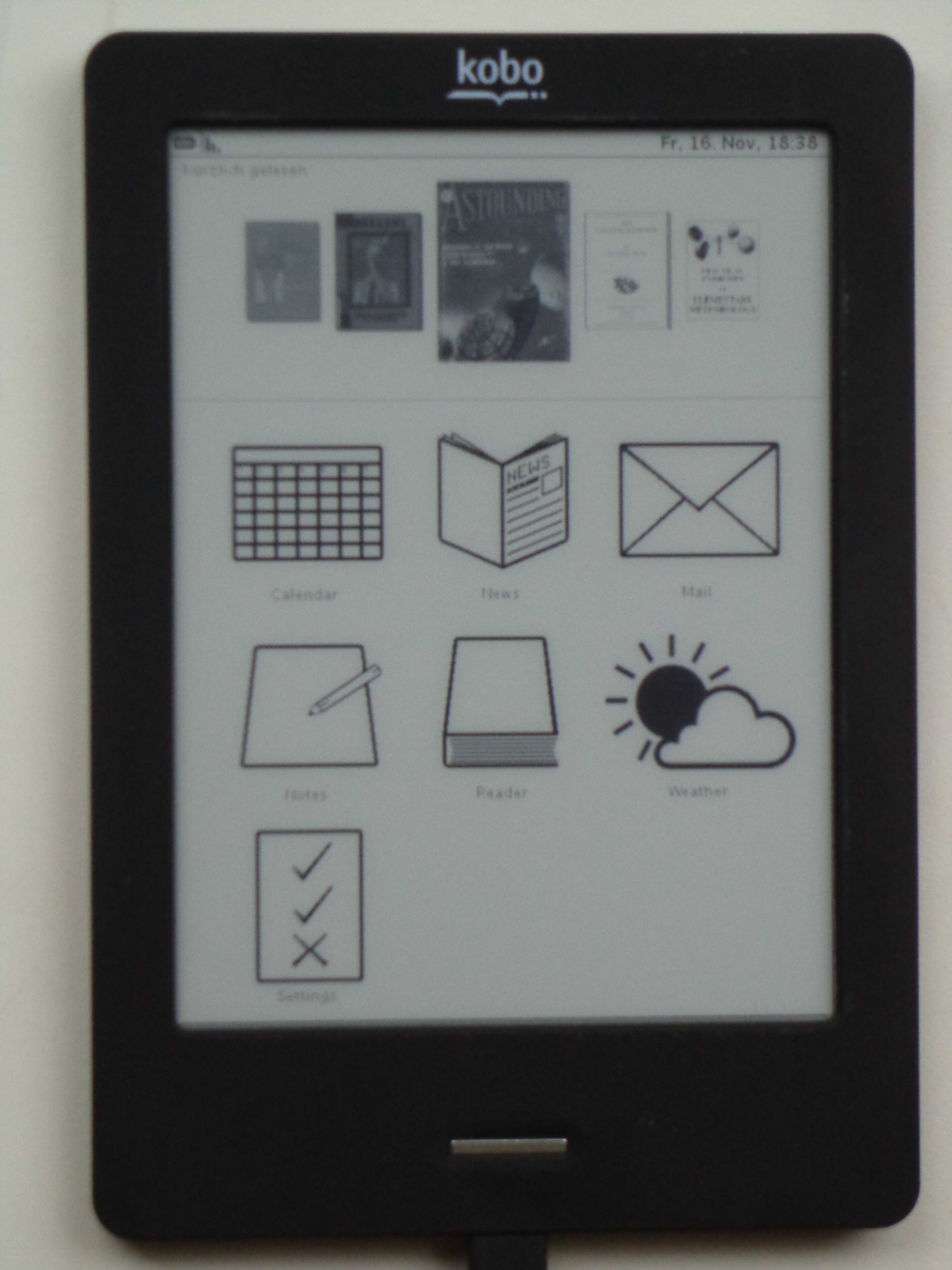 As promised a few days ago in this thread https://www.mobileread.com/forums/sho...d.php?t=195514, I provide some pictures of my nickel replacing Java application on my Kobo Touch. The idea for this application is based on the work by Michael Zucchi (http://a-hackers-craic.blogspot.be/search/label/kobo) The first one is the Home Screen. The upper part of the screen shows a list of recently read books. The lower part contains icons for several "Applets", e.g. Calendar, News, Mail or Reader. The Calendar can be displayed in a month, week or day view. One can switch through the different views by tapping on the icons at the right part of the menu bar. With a swipe to the left or to the right one can go a month, a week or a day back or forward. By a long tap one can create a new event, by a normal tap on an existing event one can modify the details of the event. The events are stored in a file in XCAL (XML iCal)format. I hope to implement in future a synch mechanism for my thunderbird calendar at home. The Reading Applet shows the existing book categories as a tag cloud considering the number of books in a particular category. Currently the category structure is file system based, that means each category is a directory in file system. That makes it easy to manipulate categories and add or remove books. After a tap on a category, a list of the books in that category is diplayed to select the book to read (I haven´t finished this work yet). The News Applet displays my favorite online news. A separate application crawls the news webpages and compiles an ePub (without advertisements and pictures). The Weather Applet is inspired by the great work of KevinShort https://www.mobileread.com/forums/sho...d.php?t=194376 As it can be seen on the pictures the User Interface is not consistent yet, some menu items are displayed as icons some as text. I am to date not sure what will be the best solution. Also one can notice a lot of ghosting on the pictures, but this will be fixed in the future. All in all, there is still much room for improvement and a lot of work to be done. Any feedback is appreciated whether the community might be interested in my replacement of nickel or whether further developement is for my purpose only (then I do not have to clean up and comment the code )