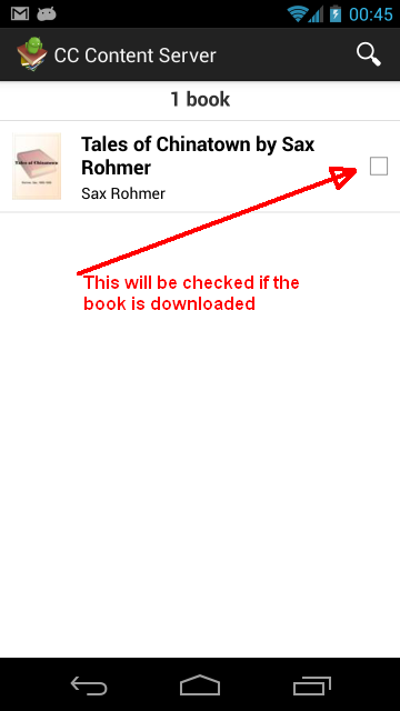 You can tell you are connected to the content server because before tapping on a book to see its details, the action bar says "CC Content Server". If you are connected to the content server, the page displaying books will have a check mark next to the book if the book is downloaded. See the screen capture below. You should tap the "back" button until you disconnect from the content server. At that point you will see only books you have already downloaded, not books that are available for downloading from your calibre server. Edit: Assuming that you have downloaded books, once you have disconnected from the content server you will also be able to use CC's grouping, sorting, and searching facilities. Edit 2: You might want to try connecting as a wireless device. This mode is far better for doing bulk downloads than the content server. Once connected, you can use calibre to "send to device" the books you want on your tablet, and can use calibre's books-on-device display to bulk delete books from your tablet.. Last edited by chaley; 11-26-2012 at 08:20 PM. |