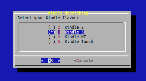 kdialog --title "Kindle debricking" --yesno "Do you really want to debrick your Kindle ?" 5 50 dialog --title "Kindle debricking" --yesno "Do you really want to debrick your Kindle ?" 5 50 kdialog --title "Kindle debricking" --radiolist "Select your Kindle flavour" "2" "Kindle 2" 2 "3" "Kindle 3" 3 "4" "Kindle NT" 4 "5" "Kindle Touch" 5 dialog --title "Kindle debricking" --radiolist "Select your Kindle flavour" 12 50 7 "2" "Kindle 2" 2 "3" "Kindle 3" 3 "4" "Kindle NT" 4 "5" "Kindle Touch" 5 |
