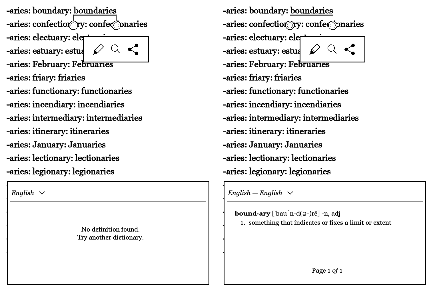 I would like to mention that the performance of the English definitions dictionary (and presumably also of other dictionaries) could easily be improved by making better use of the variants that are recorded in the dictionary. Currently, variants seem not to be taken into consideration, when they are available only in abbreviated form, like "-aries" in the case of "boundary". To check this, I went through the dictionary and resolved the abbreviated variants. I add some images for illustration.