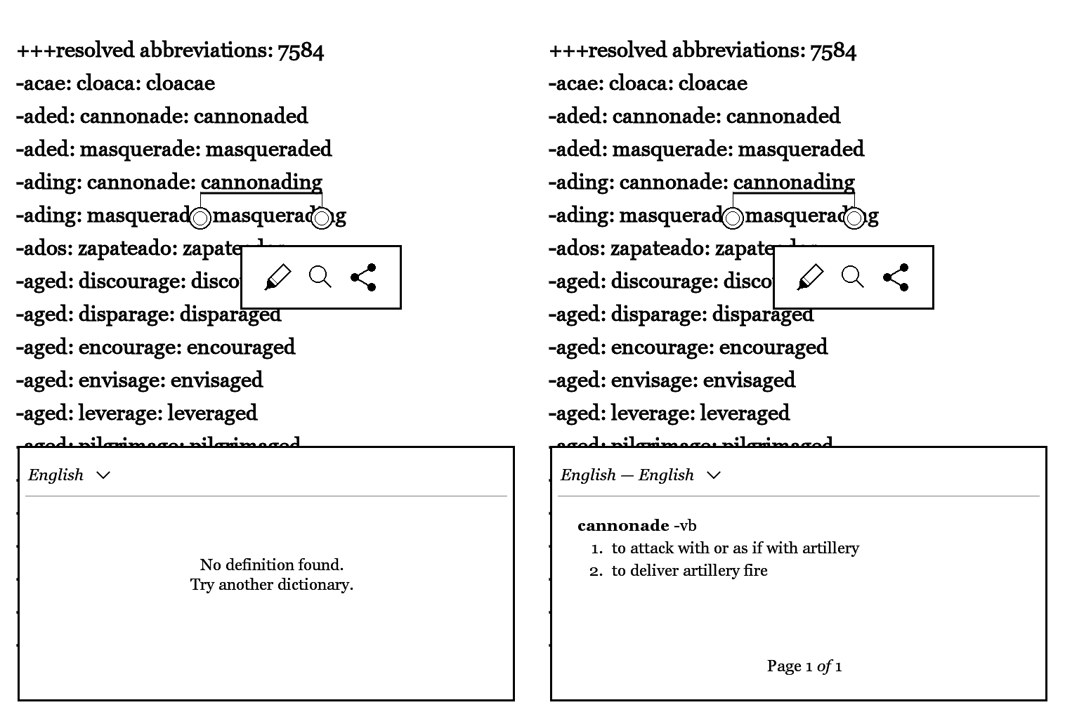 I would like to mention that the performance of the English definitions dictionary (and presumably also of other dictionaries) could easily be improved by making better use of the variants that are recorded in the dictionary. Currently, variants seem not to be taken into consideration, when they are available only in abbreviated form, like "-aries" in the case of "boundary". To check this, I went through the dictionary and resolved the abbreviated variants. I add some images for illustration.