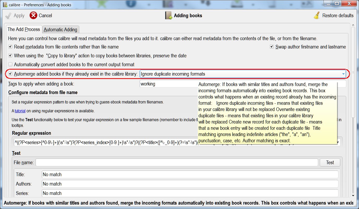 I have not find a way to let configure calibre to avoid adding of duplicates when copying books to another library. I can only merge. Is this feature present ? |