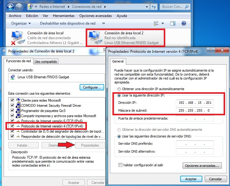 Toda la información y archivos a utilizar han sido recopilados de diversos hilos del foro de desarrolladores de Kindle, aquí mismo en Mobileread. La mayoría de los archivos y utilidades han sido creadas o puestas a disposición del público por ixtab, el autor de muchas de las utilidades no-oficiales para Kindle, y uno de los mayores desarrolladores actualmente. He recopilado en un paquete todo lo necesario. Lo puedes descargar de aquí. Una vez descargado y descomprimido en una carpeta, comenzamos: Para poder hacer esta restauración del firmware, el Kindle debe funcionar más o menos correctamente. Si tu ebook no es capaz de iniciarse, en el paquete tienes una guía de "desenladrillado" en PDF en inglés, creada por Silver18 y bastante fácil de seguir, que te ayudará a hacerlo arrancar de nuevo. Requisitos previos: Necesitas tener hecho el Jailbreak, e instalado el SSH. El acceso mediante el SSH se puede conseguir instalando el Laucher 1.2.2 (recomendado), o el simple usb network 1.1.2. Ambos van incluidos en el paquete que te habrás descargado. Si ya tienes instalado cualquiera de ellos, puedes pasar directamente a la sección de copia de archivos. Para instalar el Launcher, basta con conectar el Kindle al ordenador mediante el cable USB, copiar en la raíz del dispositivo el archivo update_launcher_1.2.2_install.bin, desconectarlo, encenderlo y desde la pantalla principal pulsar el botón Menú - Configuración. A continuación, otra vez Menú - Actualizar mi Kindle. Se iniciará la instalación del Launcher, y una vez finalizada esta, se reiniciará el dispositivo. Una vez instalado, desde la pantalla principal del Touch pulsamos Menú y veremos que hay una nueva entrada llamada Launcher. Al pulsar sobre ella aparecerá un menú similar al que se puede ver en la imagen. Sólo hay que seleccionar la entrada Start Ubsnetwork para activar el acceso SSH a nuestro Kindle. ![]() Sólo si por cualquier razón lo anterior no funcionara, podemos activar también el SSH usando el simple usb network 1.1.2. Se instala exactamente igual que Launcher (copiando el update_simple_usbnet_1.1_install.bin a la raíz del Kindle, e indicándole después que actualice el dispositivo). Para activarlo basta con escribir ;un en la ventana de búsqueda de la pantalla principal del Kindle. Y para configurar la contraseña de acceso, se hace escribiendo en la misma ventana de búsqueda ;un password CONTRASEÑA, donde CONTRASEÑA es la que nos va a dar acceso al SSH. Se puede poner la que se quiera, nosotros en la explicación usaremos mario, porque es la que trae por defecto el Launcher. Copia de archivos Ya tenemos preparado el Kindle para poder realizar una conexión mediante SSH con nuestro ordenador. Pero antes, con el USBnetwork desactivado, deberemos conectarlo al ordenador mediante el cable USB, y copiar en la raíz del aparato los siguientes ficheros: kt_5.0.0-kernel_diags.gz kt_5.1.2-kernel_main.gz kt_5.1.2-mmcblk0p1-main+jb+kjb+ssh.img.gz Una vez realizado esto, expulsamos de forma segura el Kindle (como cualquier dispositivo USB), desconectamos el cable USB del ordenador, y desde la pantalla principal activamos el USB Network, bien usando el Launcher (Menú - Launcher - Start Usbnetwork), o si hemos tenido que instalar el usb network, tecleando ;un en el cuadro de búsqueda de la ventana principal. Conectando al Kindle mediante el SSH: Ya tenemos en el Kindle activado el Ubsnet. Es el momento de conectarlo al ordenador con el cable USB. Si ya lo tenías conectado antes, desconéctalo y vuélvelo a conectar para que el ordenador lo detecte de nuevo. Al cabo de unos 20 segundos, Windows lo detectará e instalará el driver correspondiente de forma automática, o nos lo solicitará, dependiendo del sistema operativo. En este último caso, en la carpeta "Driver" del paquete de utilidades podréis encontrar el driver correspondiente para Windows 7 ó Windows XP. Una vez instalado, aparecerá una nueva conexión de área local. Para acceder a ella, en Windows 7 la ruta es Botón inicio - Panel de Control - Redes e Internet - Centro de redes y recursos compartidos - Cambiar configuración del adaptador. También es posible acceder haciendo click con el botón derecho del ratón sobre el icono de conexión a Internet (en la barra de tareas, junto al reloj del sistema), y eligiendo Abrir el centro de redes y recursos compartidos, y luego pinchando en Cambiar configuración del adaptador. Y, más sencillo aún, botón Inicio y teclear simplemente en el cuadro de búsqueda Conexiones de red. [Image violates Posting Guidelines for size - MODERATOR] Es necesario pinchar con el botón derecho del ratón sobre la nueva conexión de área local (normalmente se llamará Conexión de área local 2, 3, etc. Será la que tenga el número más alta, o aquella en la que en la descripción mencione algo del RNDIS), y elegir Propiedades. Luego marcar el Protocolo de Internet versión 4 (TCP/IP), y pulsar el botón Propiedades. En la ventana que se abre sólo tenemos que especificar la dirección IP: 192.168.15.201, y la máscara de subred: 255.255.255.0. El resto de opciones se pueden dejar en blanco, y ya tan solo hay que pulsar Aceptar para cerrar todas las ventanas de las propiedades de la conexión. Ya tenemos la conexión configurada y estamos en condiciones de acceder a nuestro Kindle vía SSH. En Linux y Mac OS, es posible hacerlo desde la línea de comandos sin más que teclear root@192.168.15.244 (192.168.15.244 es la dirección IP que usa el Touch por defecto, y root es el nombre de usuario). Cuando solicite la contraseña, habría que ponerle mario, que es la que tiene por defecto. En Windows, como no tenemos cliente de SSH por defecto, podemos usar el programa putty. También está incluido en el paquete de utilidades. Basta con ejecutar putty.exe, y poner como Host name la IP del Kindle, 192.168.15.244, el Port (puerto) se deja el que pone por defecto, 22, y en Connection Type elegimos SHH. El resto de pa
