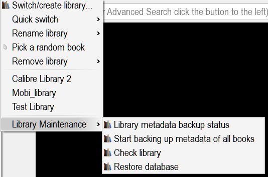 I click the chevron at the right of the Library button, I have: Show books in Calibre Library --------------------------- Switch/Create Library. No database functions. -fm |