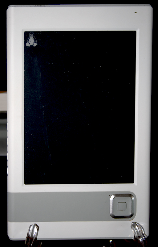 As you all may know, Open Inkpot (OI) is creating a nice Linux variant for the various e-ink readers out there. Ondrej is working on the port to the Cybook family of readers (from Bookeen, Ganaxa, Orsio, STAReBOOK, Astak, Netronix, etc.) He's gotten to the point where he can get the Linux kernel running and displaying Tux. He graciously loaned me a copy and I just got done running the kernel on both my Cybook Gen3 (the 512MB model) and my EB-100 from Netronix. I've taken pictures of Tux happily appearing on the display and I'm posting them here.