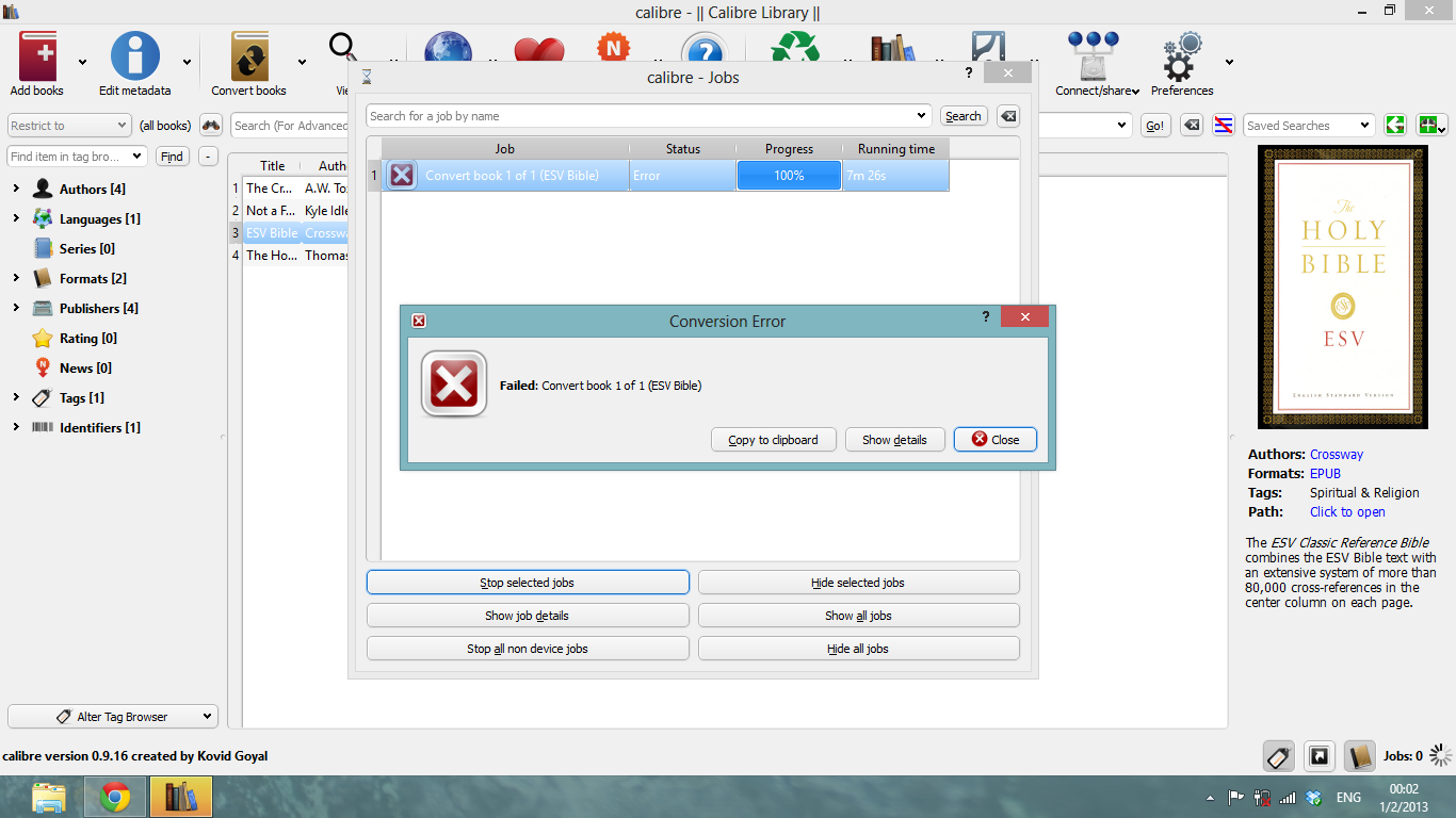 Convert book 1 of 1 (ESV Bible) Qt: Untested Windows version 6.2 detected! Resolved conversion options calibre version: 0.9.16 {'asciiize': False, 'author_sort': None, 'authors': None, 'base_font_size': 0.0, 'book_producer': None, 'change_justification': u'original', 'chapter': u"//*[((name()='h1' or name()='h2') and re:test(., '\\s*((chapter|book|section|part)\\s+)|((prolog|pr ologue|epilogue)(\\s+|$))', 'i')) or @class = 'chapter']", 'chapter_mark': u'pagebreak', 'comments': None, 'cover': u'C:\\Users\\Phua\\AppData\\Local\\Temp\\calibre_0 .9.16_tmp_mm91ay\\cgkuj4.jpeg', 'debug_pipeline': None, 'dehyphenate': True, 'delete_blank_paragraphs': True, 'disable_font_rescaling': False, 'dont_compress': False, 'duplicate_links_in_toc': False, 'embed_font_family': None, 'enable_heuristics': False, 'extra_css': None, 'extract_to': None, 'filter_css': u'', 'fix_indents': True, 'font_size_mapping': None, 'format_scene_breaks': True, 'html_unwrap_factor': 0.4, 'input_encoding': None, 'input_profile': <calibre.customize.profiles.InputProfile object at 0x03FD6CD0>, 'insert_blank_line': False, 'insert_blank_line_size': 0.5, 'insert_metadata': False, 'isbn': None, 'italicize_common_cases': True, 'keep_ligatures': False, 'language': None, 'level1_toc': None, 'level2_toc': None, 'level3_toc': None, 'line_height': 0.0, 'linearize_tables': False, 'margin_bottom': 5.0, 'margin_left': 5.0, 'margin_right': 5.0, 'margin_top': 5.0, 'markup_chapter_headings': True, 'max_toc_links': 50, 'minimum_line_height': 120.0, 'mobi_toc_at_start': False, 'no_chapters_in_toc': False, 'no_inline_navbars': False, 'no_inline_toc': False, 'output_profile': <calibre.customize.profiles.KindleOutput object at 0x03FE3030>, 'page_breaks_before': u'/', 'prefer_author_sort': False, 'prefer_metadata_cover': False, 'pretty_print': False, 'pubdate': None, 'publisher': None, 'rating': None, 'read_metadata_from_opf': u'C:\\Users\\Phua\\AppData\\Local\\Temp\\calibre_0 .9.16_tmp_mm91ay\\cp8q5w.opf', 'remove_fake_margins': True, 'remove_first_image': False, 'remove_paragraph_spacing': False, 'remove_paragraph_spacing_indent_size': 1.5, 'renumber_headings': True, 'replace_scene_breaks': u'', 'search_replace': '[]', 'series': None, 'series_index': None, 'share_not_sync': False, 'smarten_punctuation': False, 'sr1_replace': None, 'sr1_search': None, 'sr2_replace': None, 'sr2_search': None, 'sr3_replace': None, 'sr3_search': None, 'start_reading_at': None, 'subset_embedded_fonts': False, 'tags': None, 'timestamp': None, 'title': None, 'title_sort': None, 'toc_filter': None, 'toc_threshold': 6, 'toc_title': None, 'unsmarten_punctuation': False, 'unwrap_lines': True, 'use_auto_toc': False, 'verbose': 2} InputFormatPlugin: EPUB Input running on C:\Users\Phua\AppData\Local\Temp\calibre_0.9.16_tm p_mm91ay\xifbbd.epub Found HTML cover OEBPS/Text/a000.front-cover.html Parsing all content... Parsing OEBPS/Text/b23.02.Isaiah.text.html ... Parsing OEBPS/Text/b23.03.Isaiah.text.html ... Parsing OEBPS/Text/b23.00.Isaiah.footnotes.html ... Parsing OEBPS/Text/b23.00.Isaiah.crossrefs.html ... Parsing OEBPS/Text/b23.01.Isaiah.crossrefs.html ... Parsing OEBPS/Text/b23.02.Isaiah.crossrefs.html ... Parsing OEBPS/Text/b23.03.Isaiah.crossrefs.html ... Parsing OEBPS/Text/b24.00.Jeremiah.main.html ... Parsing OEBPS/Text/b65.00.Jude.main.html ... Parsing OEBPS/Text/b65.00.Jude.text.html ... Parsing OEBPS/Text/b65.00.Jude.footnotes.html ... Parsing OEBPS/Text/b65.00.Jude.crossrefs.html ... Parsing OEBPS/Text/b66.00.Revelation.main.html ... Parsing OEBPS/Text/b66.00.Revelation.text.html ... Parsing OEBPS/Text/b66.00.Revelation.footnotes.html ... Parsing OEBPS/Text/b66.00.Revelation.crossrefs.html ... Parsing OEBPS/Text/b24.00.Jeremiah.footnotes.html ... Parsing OEBPS/Text/d24.resources.html ... Parsing OEBPS/Text/d07.resources.html ... Parsing OEBPS/Text/d08.resources.html ... Parsing OEBPS/Text/d34.resources.html ... Parsing OEBPS/Text/d09.resources.html ... Parsing OEBPS/Text/d10.resources.html ... Parsing OEBPS/Text/d11.resources.html ... Parsing OEBPS/Text/d12.resources.html ... Parsing OEBPS/Text/d13.resources.html ... Parsing OEBPS/Text/b24.03.Jeremiah.crossrefs.html ... Parsing OEBPS/Text/d15.resources.html ... Parsing OEBPS/Text/d16.resources.html ... Parsing OEBPS/Text/d17.resources.html ... Parsing OEBPS/Text/d18.resources.html ... Parsing OEBPS/Text/d19.resources.html ... Parsing OEBPS/Text/d20.resources.html ... Parsing OEBPS/Text/d21.resources.html ... Parsing OEBPS/Text/d22.resources.html ... Parsing OEBPS/Text/d23.resources.html ... Parsing OEBPS/Text/b26.00.Ezekiel.main.html ... Parsing OEBPS/Text/d25.resources.html ... Parsing OEBPS/Text/b26.00.Ezekiel.text.html ... Parsing OEBPS/Text/d27.resources.html ... Parsing OEBPS/Text/b26.01.Ezekiel.text.html ... Parsing OEBPS/Text/d29.resources.html ... Parsing OEBPS/Text/b26.02.Ezekiel.text.html ... Parsing OEBPS/Text/d31.resources.html ... Parsing OEBPS/Text/b26.03.Ezekiel.text.html ... Parsing OEBPS/Text/d33.resources.html ... Parsing OEBPS/Text/b26.00.Ezekiel.footnotes.html ... Parsing OEBPS/Text/d35.resources.html ... Parsing OEBPS/Text/b26.00.Ezekiel.crossrefs.html ... Parsing OEBPS/Text/d37.resources.html ... Parsing OEBPS/Text/b26.01.Ezekiel.crossrefs.html ... Parsing OEBPS/Text/d39.resources.html ... Parsing OEBPS/Text/b26.02.Ezekiel.crossrefs.html ... Parsing OEBPS/Text/d41.resources.html ... Parsing OEBPS/Text/b27.00.Daniel.main.html ... Parsing OEBPS/Text/d43.resources.html ... Parsing OEBPS/Text/b27.00.Daniel.text.html ... Parsing OEBPS/Text/b27.00.Daniel.footnotes.html ... Parsing OEBPS/Text/b27.00.Daniel.crossrefs.html ... Parsing OEBPS/Text/b28.00.Hosea.main.html ... Parsing OEBPS/Text/b28.00.Hosea.text.html ... Parsing OEBPS/Text/b28.00.Hosea.footnotes.html ... Parsing OEBPS/Text/b28.00.Hosea.crossrefs.html ... Parsing OEBPS/Text/b29.00.Joel.main.html ... Parsing OEBPS/Text/b29.00.Joel.text.html ... Parsing OEBPS/Text/b29.00.Joel.footnotes.html ... Parsing OEBPS/Text/b29.00.Joel.crossrefs.html ...