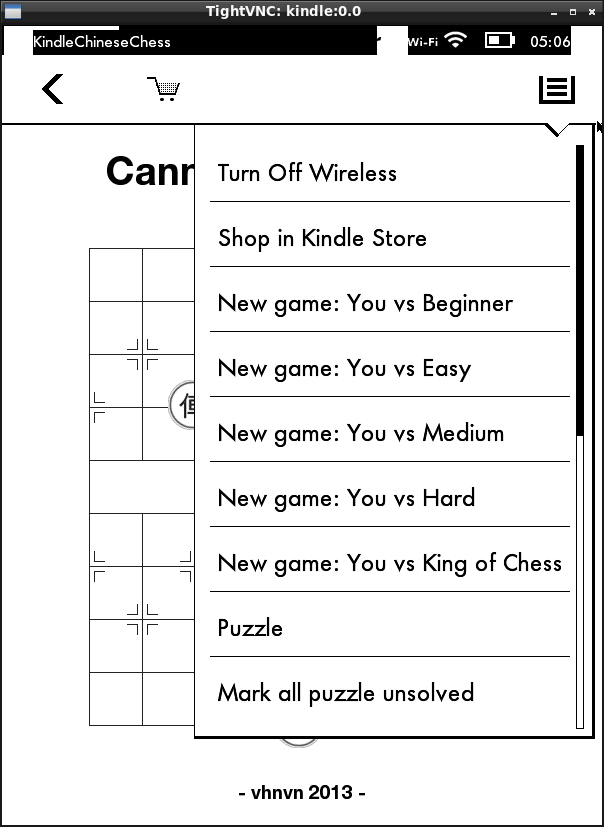 Since I have just bought my kindle (and jailbreak it), it may take quite some time before I can dig into the codes and do some changes! Not to mention I don't even know how to setup the correct development environment and get the correct toolchains for it ... As for those "Short Chess Puzzle" solutions, you may not need to provide the real solution - Just let the computer plays its part and Player's part too if wanted (with cheating) and solve it as the game goes. On a second thought of how to learn to play this game, the easiest way is JUST PLAY IT! The computer will tell you if it is an invalid move and I am pretty sure you can learn the game in no time! However, the user interface of Touch Screen may require some time to get used to it: Touch the piece you want to move, a square around it will appear. Touch the location you want to move to, another square around the location will appear if it is a valid move. Touch the place again will confirm the move. Have fun!! |