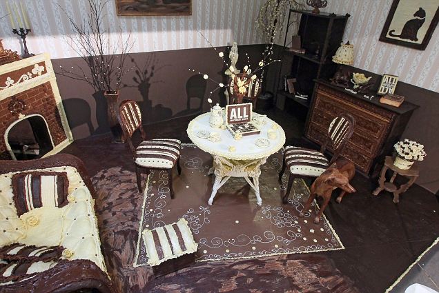 Sculptor Elena Kliment used 6ookg. of Belgian chocolate to create everything from the fireplace, to the tea cups and the chest of drawers. All ye Chocaholics help yourselves.