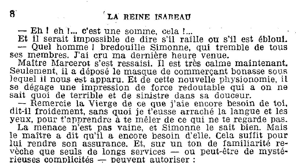 C’est à partir de http://gallica.bnf.fr/ark:/12148/bpt...=zevaco.langFR En cliquant sur « télécharger » (en haut à droite de l’écran, sous informations détaillées), puis en choisissant PDF dans """ Choisissez le format du fichier: JPEG (Seulement page à page sur la page en cours) """ L'image jointe représente la page que je soumettais au logiciel K2pdfopt |