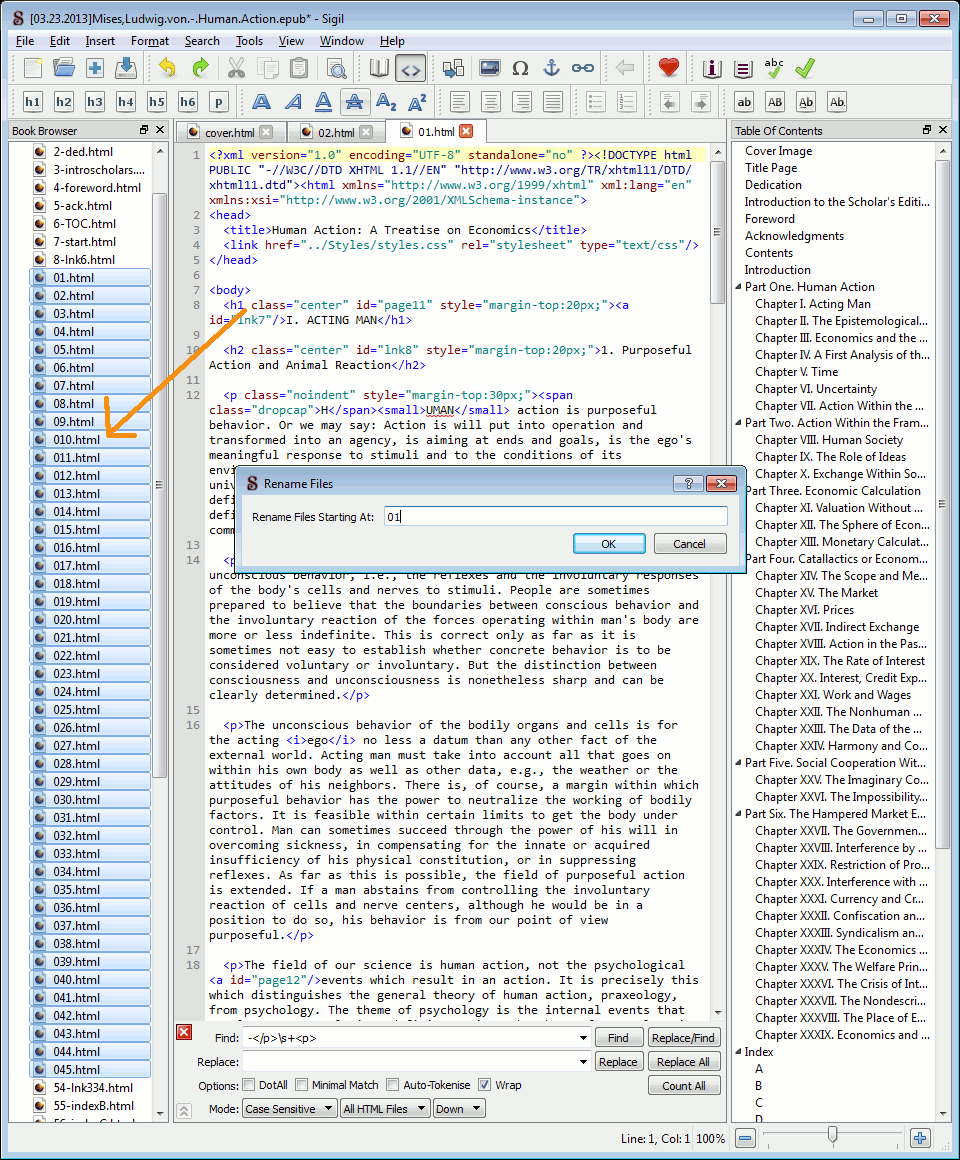 Every time you press Ctrl+S (or whatever Quicksave would be set to), it would save to the next slot, and then roll around back to saving in Slot 1 after the quick save limit (6 by default) was reached. I am constantly pressing Ctrl+S after every few typo fixes. Having 6 quick save slots would mean if anything goes seriously wrong, I have the potential to roll back to 6 revisions ago. This would also save from the dreadful "oh crap I messed up that Regex and replaced all, now would be the perfect time for my brain to hit Ctrl+S like my brain is trained to do after doing large fixes.......... uh oh, now I can't reload the last save because all of my footnotes are ruined." This just happened to me on an EPUB that I was working on yesterday, luckily there were only maybe 20 that were broken, so I was able to manually type those back. ![]() Perhaps these quick save slots might also be a perfect time to also introduce the "Save every X minutes" that multiple people have mentioned on these boards. Bug #1: As a side note, there is a little bug that bothers me about the Mass Rename functionality. I believe this attached image should explain the bug perfectly. Bug #2: I believe it started in Sigil 0.7.0. If I remember correctly, in the previous Sigil version, whenever you loaded/ran a "Saved Search", Sigil would auto-default to "Regular Expression" mode. Now, it stays on what was the last used setting ("Case Sensitive" or "Normal"). When I run a Replace All on a few of the cleaning groups I created, the Regexes find nothing, since it is stuck on "Case Sensitive". PS: The Sigil spellcheck implementation is incredible (just as I first brainstormed on these forums). It helped me catch hundreds of typos in this EPUB, and it is the BEST way to catch wrongly hyphenated words from OCR or bad conversions. Last edited by Tex2002ans; 03-24-2013 at 08:11 PM. |
