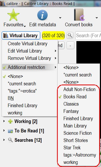 I can't check my original virtual library because I recreated it. What it had in the search area was "Finished Library" which in theory pointed to a saved search called "Finished Library" I don't recall if I clicked it or not. @chaley See attached, It doesn't matter to me one way or the other, but as a user of the restrict to feature for a long time I expected all of the "additional restriction" items to be translated directly as virtual libraries in the new setup. Since I was using them as a top level restriction. Update: Compose my thoughts and three other messages pop-up. Further update: I deleted some Saved searches, but those Saved searches were not removed from the Additional restriction list. Is this list a history type list with a finite number allowed before they roll off the end? Last edited by DoctorOhh; 04-13-2013 at 12:43 PM. |