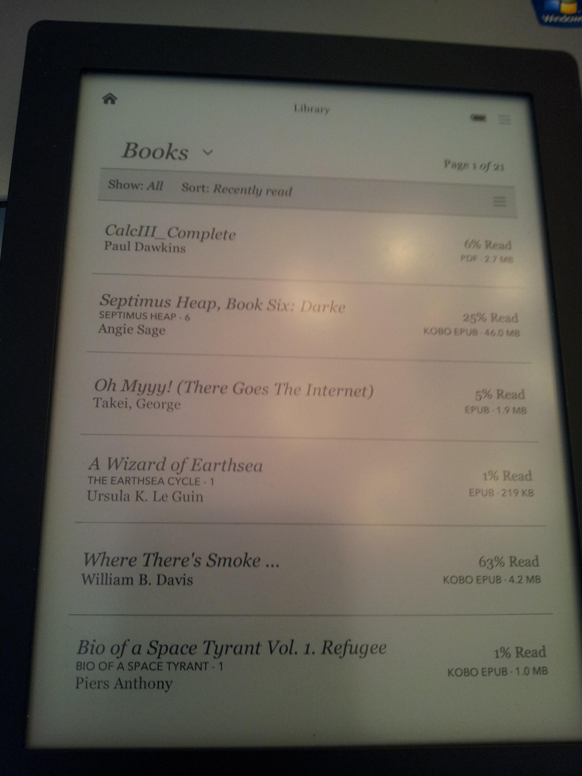 Device: Kobo (loaned out), KoboTouch (given away), KoboVox, KoboGlo, AuraHD