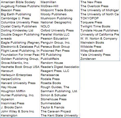 Well, your question, Dennis, has led me to acquire some better data from the Sony site. Since I can search the Sony site by publisher I did that for each of them and have put the totals into a spreadsheet. Here is a text file containing all of the publishers that Sony lists followed by the number of titles by each that Sony has for sale. I have sorted these from highest (Taylor & Francis Publishing with 13,567 titles) to lowest (John Wiley & Sons with 1 title, for example). If you add up all of these titles and add the 958 Sony Classics (the public domain titles that Sony sells), you get a total of 46,585 ebooks for sale at Sony. That sounds about right to me since the 50,000 that you get by summing by all the listings in each category we know includes some multiple counts. So, yes, I think this just might be all the publishers that Sony sells ebooks for. I hope you'll take a look and make note of any major holes (particularly as they compare with Amazon).