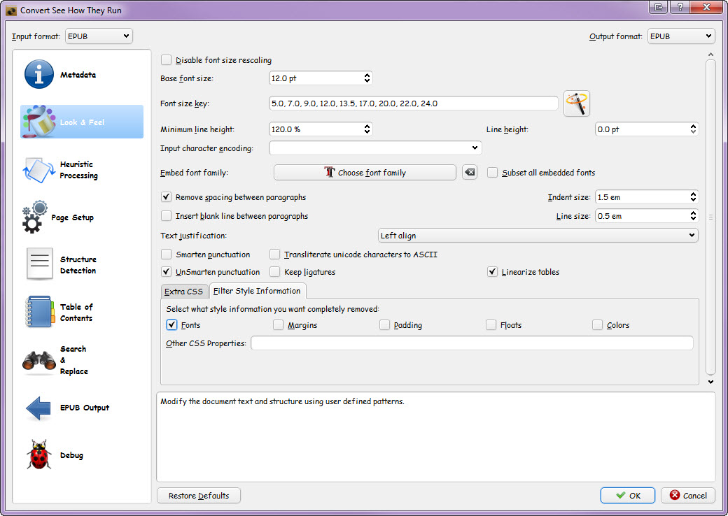 Calibre has built in functionality to either imbed a font and/or remove the CSS font definitions. This can be done through the Convert Books functionality. I do this for my Mobi files with success, so it should work for ePub files as well. Use the Convert Books screen, and and set the Output format to ePub (you can convert ePub to ePub). Select Look & Feel. Click the Filter Style Information tab (in the middle of the page). Check the Font box. Then click OK to run the conversion. This should generate a new ePub file with CSS font defs removed, so it will pick up the default font on your device. Note: It will also make any other changes specified for the conversion, so you will want to back up your book file prior to testing out. See screen shot below. Important: I remember there being an option on calibre that, when performing a conversion to an existing format, a backup/rename of the original file would be performed. I can't find this option anymore, but it appears that calibre does the backup in this case. Does anyone know if the option was removed and this is now the standard behavior? If this works for you, you can set up the defaults for this screen via Preferences -> Change calibre behavior -> Conversion: Common Options Hope this is helpful. |
