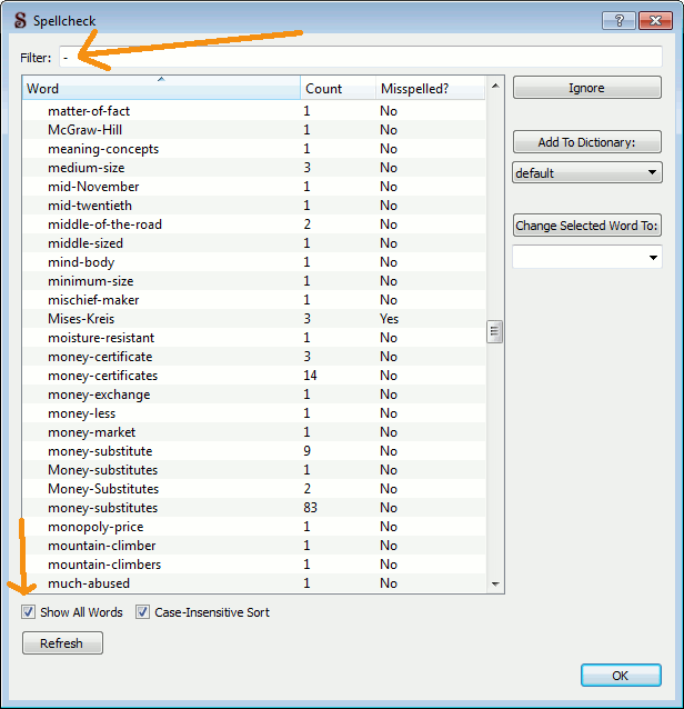 In 0.6, I was hackishly using the Index Editor to try to find every hyphenated word that was misspelled (I was probably the only person who exists who used it like that?). The spellcheck list is infinitely better than anything else I have used. I have zero clue why it isn't in your typical word processor program. Now I can't live without it, and it saves me hours of time fixing typos. |
