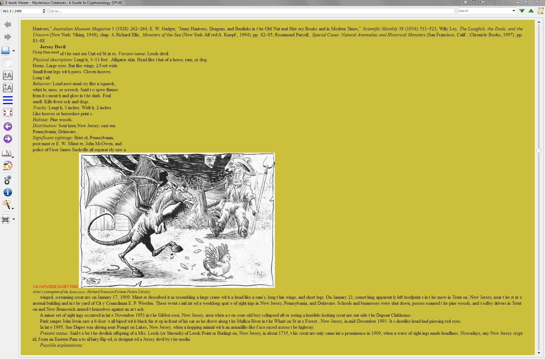 the file I've chosen to report is one of dozens, but here it is. Title: Mysterious Creatures_ A Guide to Cryptozoology, 2 Volume Set - George Eberhart.pdf As it's copyrighted, I've uploaded only an excerpt: File Attached: png image of one page with a graphic: "Mysterious Creature (page).png create a bug with the file attached in the calibre bug system ... as far as I can tell, there isn't a calibre bug system in calibre, but outside the application there is a website at Launchpad where you can report new bugs etc. I think it's premature to use that here, so I think there must be some bug plug or something that I do not have installed that I'm meant to be using. I can't find it. The conversion log from calibre: very large. saved it as a text file: conversion log 1 conversion log 2 Note: i noticed a boat load (many many pages of detailed log history) of hyphenation changes, so I changed my conversion specs to not include heuristic processing or hyphenation correction, reran it. (I had only started using heuristic processing after researching what was going on with my pdf conversion as somewhere I found a post recommending adding heursitic, changing the "split" amount to something higher, and something else I don't remember). conversion output: two sets, both included only collections of images which calibre's bug doohickey put into a directory called "input" Both of them are very lengthy collections of images extracted from the pdf. some examples are attached. Both conversions I ran tonight timed out at 10 minutes. I can't find how/where to change the timeout limit, but 10 minutes for one file does seem rather long... I don't have conversion logs for the initial failures of my several hundreds of pdfs, however before I started messing around trying to fix this problem, the resulting failures were not time-out failures, but actual failures. I am sorry I did not figure out the log stuff until after I'd made so many changes. My latest conversion options are as simple as possible: default convert to epub with these exceptions: a) confirmed no heuristic processing or special requests for hypenation, line changes, etc but does include a check box for the cover aspect ratio retention b) The first conversion specified "tablet" (I think, that's what it's been on), the second specified "ipad" output, both did request insertion of updated metadata jacket and cover c) input set as "generic" I think that about does it. |