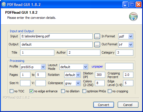 return image.filter(ImageFilter.MinFilter(5)) Could you test to see which resulting .lrf (first 5 pages only) looks better on the hardware reader? (Sorry for the stretch of short pages, I still have to fix that one!!!) What about the comparison with PDFLRF now? p.s. I provide the modified PDFRead bin files which should be placed in the bin directory and overwrite the existing files. Just take a backup first though should you wish to restore those original files. Last edited by nrapallo; 09-29-2008 at 10:42 AM. Reason: added image showing settings used to create .lrf |