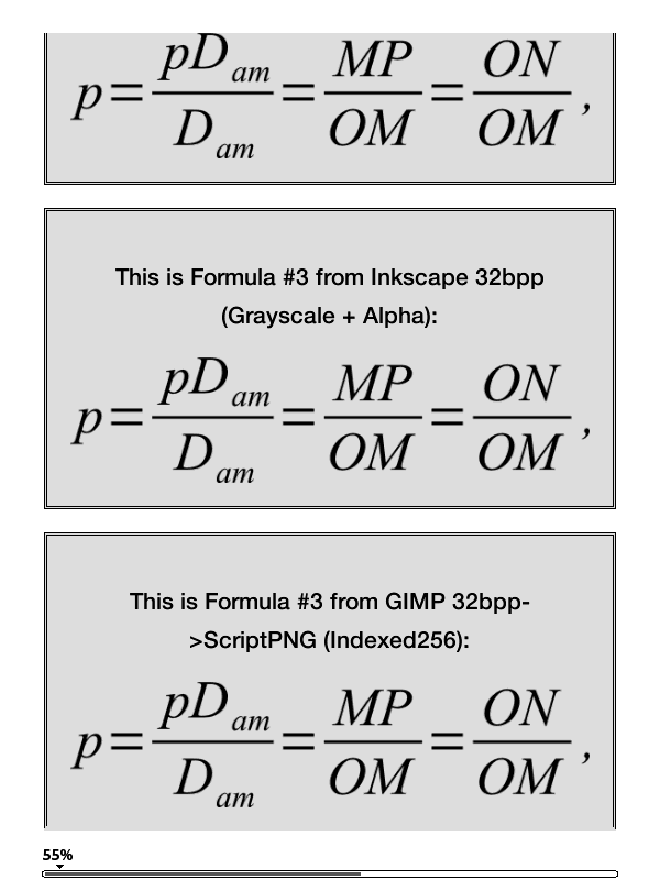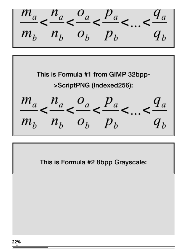 The bug: I believe these images will speak for themselves: On to the causes of the Bug: This is all just educated guesses. I used Imagemagick's "identify -verbose" on all 4 versions of Formula #1 (verbose output attached to this post). After comparing the output closely, I can see that the only major difference between Inkscape's version and GIMP's version is between color type: https://en.wikipedia.org/wiki/Portab...cs#Color_depth Inkscape's is set to 6 (RGB + Alpha) while GIMPs is set to the proper 4 (Grayscale + Alpha). Guess: Perhaps KindleGen can't handle PNG Color Type 4 images? Request: Can someone with a lot more image experience create Grayscale + Alpha images and feed them into KindleGen/Previewer? Perhaps try to create them from a different program besides GIMP (maybe Photoshop, or the multitude of others). Edit: I just tested this on my Nook + ADE, and it seems like ADE likes to break on the ScriptPNG (Indexed + Transparency), but works fine on the others. The causes of this one? No clue, maybe an Indexing + transparency is EXTREMELY rare. I would say avoid Transparency PNGs for now.