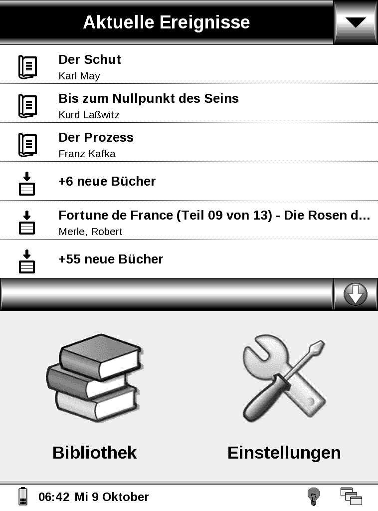 Ja ich weiß, man kann sich beim Start gleich das letzte Buch öffnen lassen. Nur haut das eben nicht mehr hin, wenn man aktuell mehr als nur ein Buch liest. P.S. Außer Bibliothek und Einstellungen würde ich noch Favoriten hinzufügen. - Dort kann man schön Bücher einstellen, die man immer wieder benötigt, die aber nicht ständig auf den ersten Plätzen der aktuellen Bücher stehen. - Oder man kann es für Vormerkungen nutzen, was man demnächst lesen möchte. Dann muss man sich das nicht merken oder anderweitig notieren. |