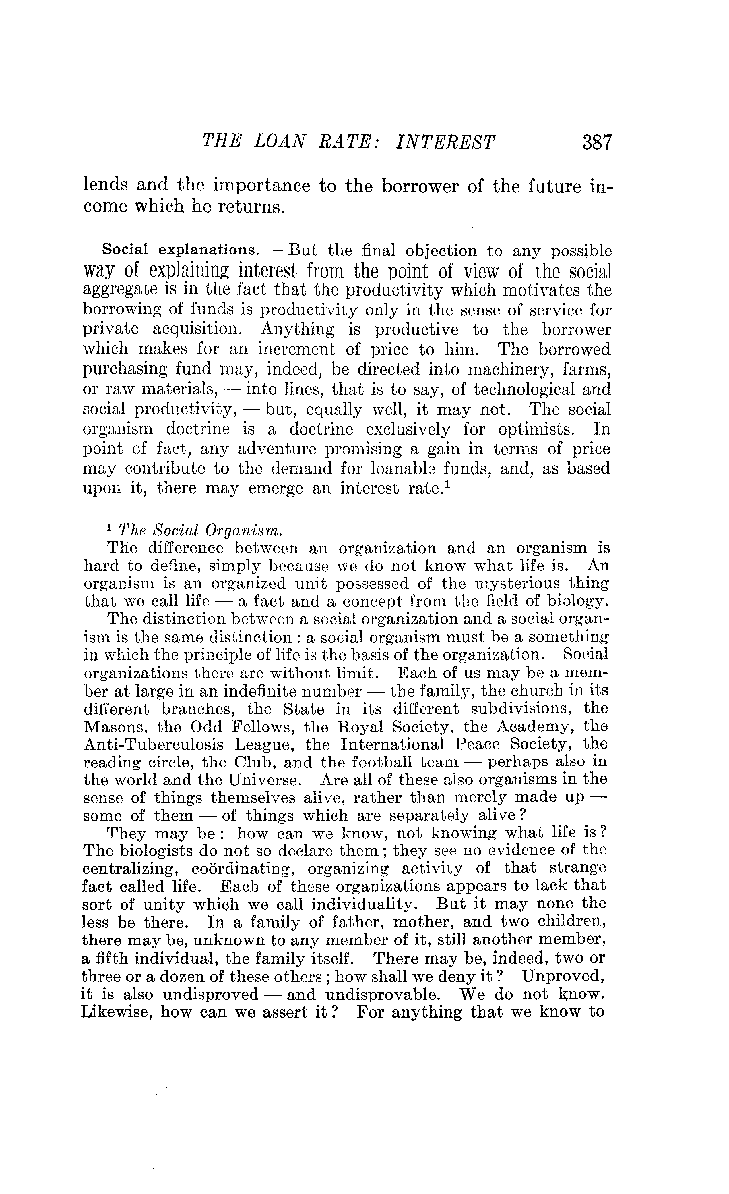 <p><sup>1</sup> <i>The Social Organism</i>.</p> <p>The difference between an organization and an organism is hard to define, simply because we do not know what life is. An organism is an organized unit possessed of the mysterious thing that we call life — a fact and a concept from the field of biology.</p> <p>The distinction between a social organization and a social organism is the same distinction: a social organism must be a something in which the principle of life is the basis of the organization. Social organizations there are without limit. Each of us may be a member at large in an indefinite number — the family, the church in its different branches, the State in its different subdivisions, the Masons, the Odd Fellows, the Royal Society, the Academy, the Anti-Tuberculosis League, the International Peace Society, the reading circle, the Club, and the football team — perhaps also in the world and the Universe. Are all of these also organisms in the sense of things themselves alive, rather than merely made up — some of them — of things which are separately alive?</p> <p>They may be: how can we know, not knowing what life is? The biologists do not so declare them; they see no evidence of the centralizing, coördinating, organizing activity of that strange fact called life. Each of these organizations appears to lack that sort of unity which we call individuality. But it may none the less be there. In a family of father, mother, and two children, there may be, unknown to any member of it, still another member, a fifth individual, the family itself. There may be, indeed, two or three or a dozen of these others; how shall we deny it? Unproved, it is also undisproved — and undisprovable. We do not know. Likewise, how can we assert it? For anything that we know to</p> <p>the contrary, every atom in the Universe may have each its separate psychic aspect and activities — herein resting the secret of chemical affinity: their souls are drawn to one another or are seeking their mates. But is it science to assert it or to assume it? And have we thereby explained anything? One mystery is not the competent solution of another. This sort of explanation is merely pseudo-explanation — faith or metaphysics or guess. In similar jargon, principles are sometimes said to be working themselves out, or to be engaged in the process of realizing themselves. But talk like this means merely that some unknown X is doing something or other. We recall from Goethe “Men often think, if only words they hear, that therewith goes material for thinking.” So also Gilbert and Sullivan:</p> <blockquote> <p>“Her gentle spirit rolls</p> <p>Through the melody of souls; —</p> <p>Which is doubtless very pretty,</p> <p>But I don’t know what it means.”</p></blockquote> <p class="noindent">Nevertheless it may roll. It may be that the Universe, as a unified organized thing, is alive in every detail — an organism in the biological sense — as Pan-psychism declares to be the ultimate truth. Surely somewhere in the Universe all that there is in it has its explanation — if only we could find it. But the mere assertion of this large fact — taking it as a fact — is not an explanation of all the intermediate subordinate facts. After all, what is <i>explanation</i> in our human sense? We understand not one whit the better any single item out of a great whole, by discovering that, taking it as a whole, it stands for us as merely one gigantic flux and pow-wow. To assert this is rather so far a confession of our total lack of understanding. The social organism people greatly need to master the distinction between an explanation and a mystery. It is not the solution of a problem to give it up, nor the unriddling of your riddle to confess that you yourself have no solution.</p> <p class="margintop">Good rhetorical usage does doubtless permit us to speak of human beings in aggregates, with the use of a singular verb: <i>the Committee is agreed; the group disperses; Congress votes; the army is marching</i>. We may talk of public opinion, <i>esprit de corps</i>, the spirit of the times. But probably no one understands this collective use to imply or to assume organic unity.</p> <p>Equally well we may say that <i>the army are marching</i>, <i>the committee are agreed</i> (with one another), the proper use depending on whether the group is taken as a whole or by its constituent units; <i>the crew was exhausted</i> or <i>the crew were exhausted</i> — accordingly as we mean one thing or the other. Though the act or the situation is really one of each individual separately, there is no actual ambiguity or uncertainty involved in saying that <i>the battalion is eating dinner</i>. The activities are similar, roughly simultaneous, and are thought of in block. True, one man eats rapidly, another slowly, some little, and others much, and a few sick ones not at all, — but the expression serves, and implies its own limitations of accuracy. And so of an army, when we say that <i>it marches</i>, no doubt is even faintly suggested that each one does his own walking, works his own muscles, uses up his own tissue, and that presumably many are halt, some falling out by the wayside, while still others limp, and some swear. But no one of these differences matters for the purposes of the thought in mind. True, the expression is in strictness inaccurate, were any perversity bent on misinterpreting it. But when it comes to asserting that the army is brushing its teeth or has stubbed its toe, there is obvious difficulty.</p> <p>And for purposes of the accurate analysis of the price problem, there is really the same difficulty in thinking of a social coldness or hunger or desire or pleasure or pain. In the price problem, the need is to understand precisely how the particular individuals arrive at their respective demand prices. There is no one single homogeneous utility nor any one single aggregate demand price. Utility, for the pur