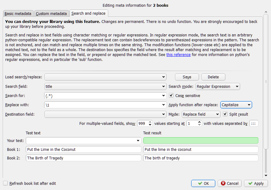 Again for future reference - you can change the 'case' of the title for an individual book via the context (right click) menu of the Title field in the single book version of Edit Metadata to one of the following UPPER CASE, lower case, sWAP cASE, Title Case Capital case (Capitalise) Bulk Metadata Edit only offers Title Case, which you could argue demonstrates a bias towards the Anglosphere - but that's true of most internetty stuff. It's something others are expected to tolerate, along with various Anglospherical misdeeds ![]() BR |
