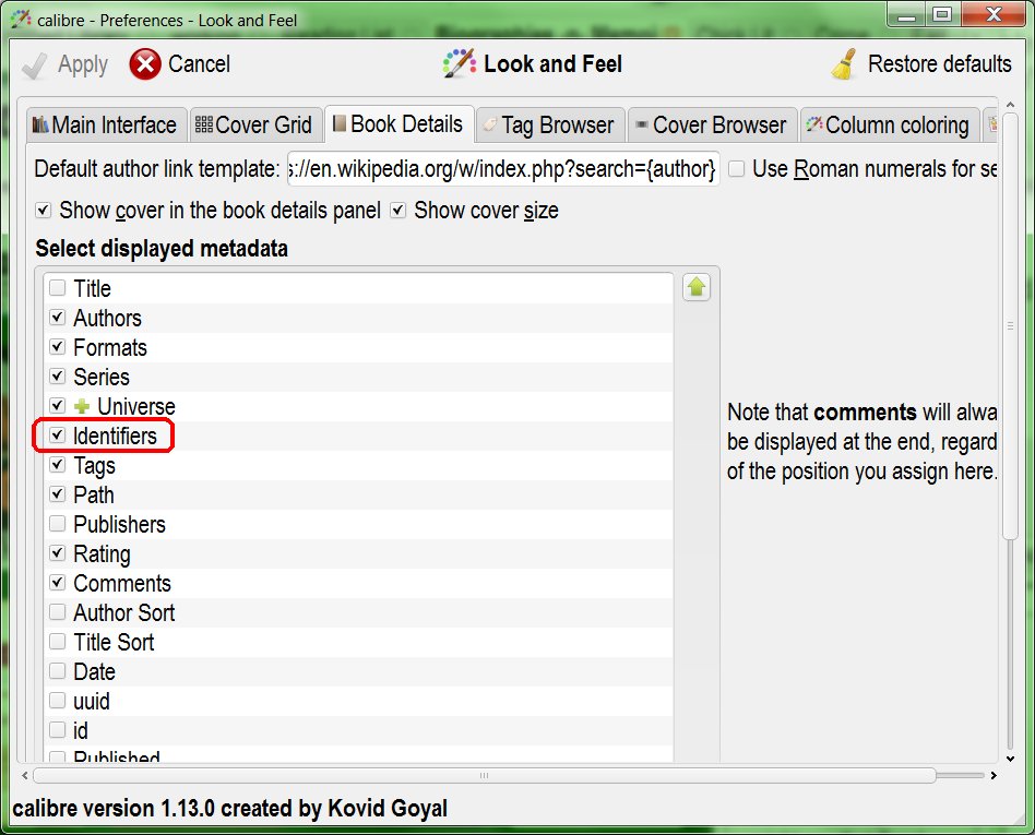 If you don't see Ids in the Book Details pane go to Preferences - Look and Feel - Book Details tab and check Identifiers, see attached. Last edited by DoctorOhh; 11-30-2013 at 01:41 AM. |