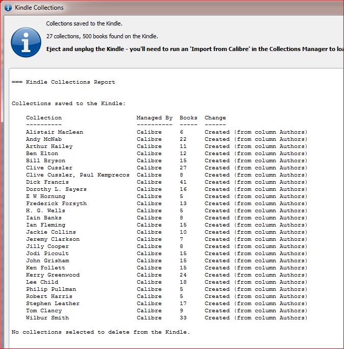 The first screen shot (CM1) shows my settings and options for the Create function. The second screen shot (CM2) Shows my manual selection just before clicking the 'save' button. The third screen shot (CM3 View Report) shows the results from 'View Report', where the manually created collection appears as the first in the list. The fourth screen shot is the detail of the collections created by the 'Save To Kindle' function - and the manually created collection is not there. After running Collection Manager's import on the Kindle Touch, the manual collection does not appear on the Kindle although all the rest do. Does the warning (on attachment 2) about 'Create' overwriting Calibre-managed collections really mean that manual collections will be ignored so I can't do what I want to do? I am hoping this might be as simple as a wrong tick in a box somewhere, but I'd appreciate any help you folks can give. Just a link to the post with the answer would be fine! |