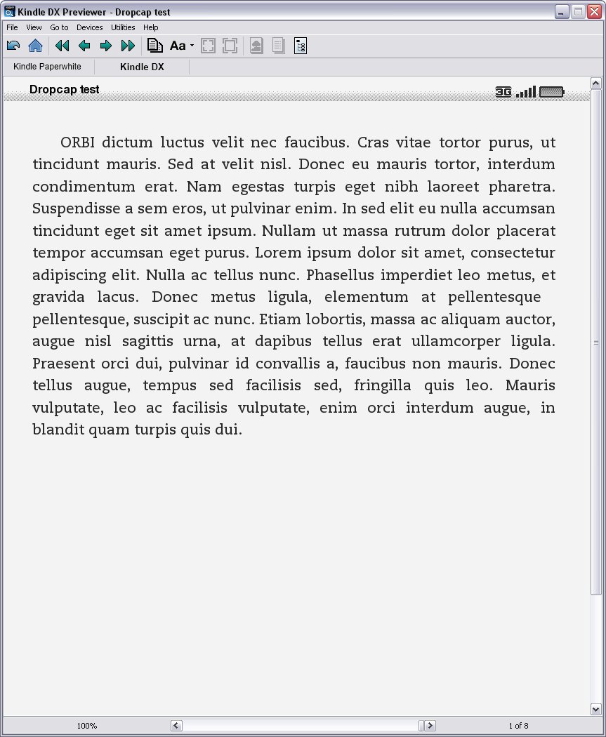Everything seems to display just fine in all the Kindles -- except in KDX. In KDX the dropcap doesn't show up -- no image at all. Here, I'll attach a screenshot of what I see... |