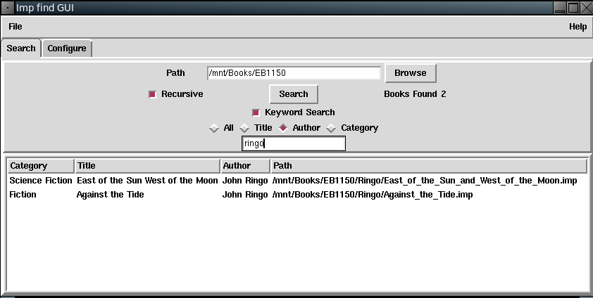 I've added a simple gui to the impfind script. Version 0.3 has both the command line version and the gui version. They work independent of each other so you can install just one of them or both. It really doesn't do much at this point except provide a gui to the search for imp format books. I plan on adding the ability to copy files selected in the search tab to a directory that can be used as your bookshelf. That way I can search for the books I want on the reader without having to hook the reader to the computer first.
