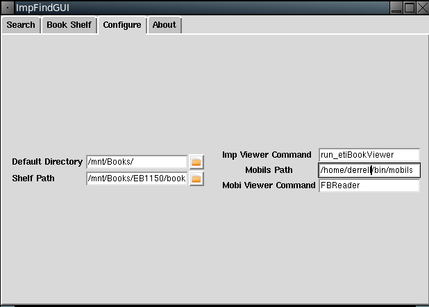 You can also now preview the imp and mobi files from the Search tab if you have the eBook Publisher viewer installed and something that will render mobipocket like FBReader. Set the paths and commands in the Configure tab. I also added graphics to some of the buttons, the images are in the ImpFind directory that is included in the archive. Where ever the scripts are installed the ImpFind directory needs to be a subdirectory of that. The script can then find them. |