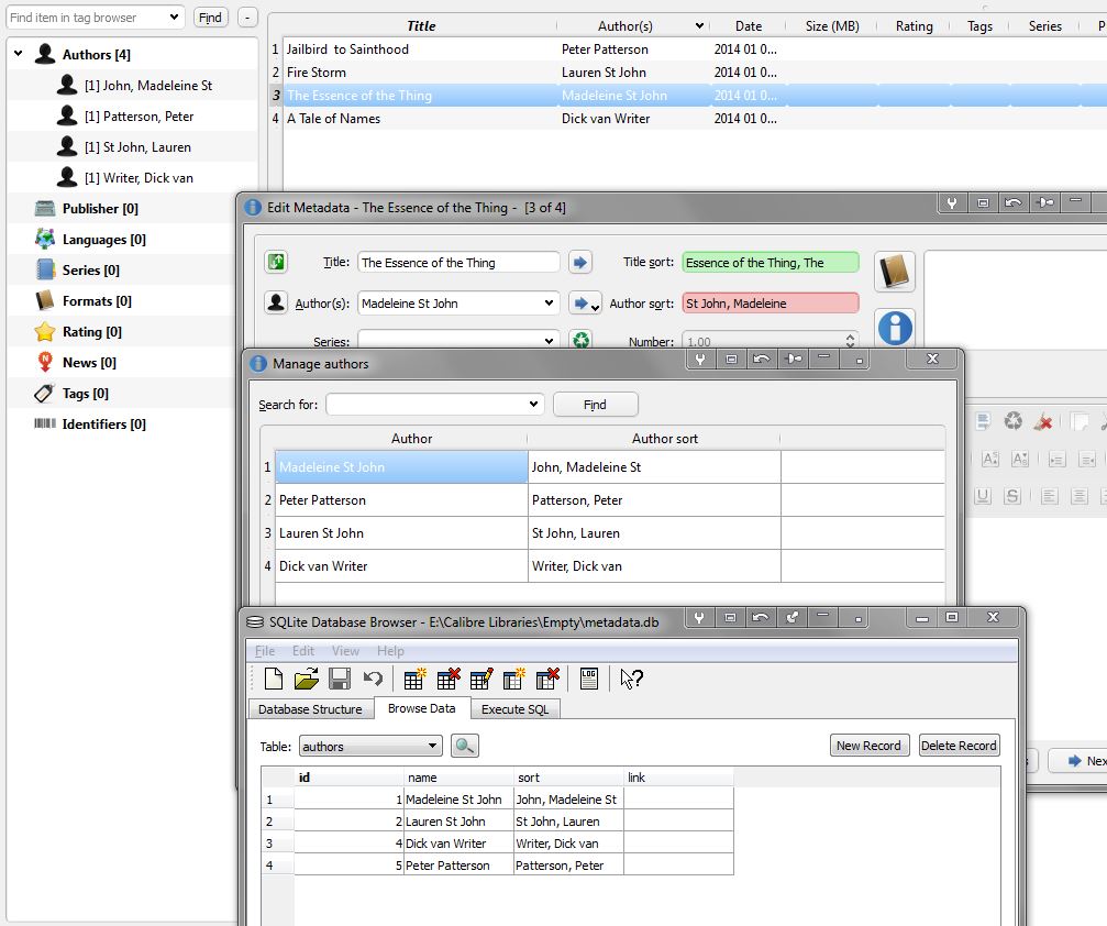 If you look at the attached screen shots you'll see the difference I'm referring to in the 'treatment' of Madeleine St John and Lauren St John. Madeleine : The 1st screen shot shows that in Metadata edit I changed the Author sort: value from John, Madeleine St to St John, Madeleine - and the text box acquired a pink background. Yet the Manage Authors list, Tag Browser and database still show John, Madeleine St... yes I have clicked OK on the edit, and gone back to it - see 2nd screen shot for a quality check on author_sort. However look at the book list - Madeleine St John is sorted as St John, and shown after Lauren St John which is what I want, but... what about the rest. Lauren : In Manage Authors I changed the Author sort cell value from John, Lauren St to St John, Lauren and hit OK, in the 3rd attachment you'll see that this is what's shown in Metadata Edit - and the text box background is green. And in the Manage Authors list, the Tag Browser and the database its shown as St John, Lauren and of course its sorted as St John. I like this as I not only get what I want (manual control over the sort name as and when required), I also see the value I want, and I don't get any pink text boxes or 'spurious' reports from the QC Check author sort function. maybe this is not the way Calibre is supposed to work. I think I stumbled on this under my own steam - can't recall reading anything here about changing Author sort in Manage Authors or in the manual.But back to my original point, I think it would be nice to have something like a checkbox to the right of the Author Sort text box that became active if the default value was overtyped. If checked it would 'force' the overtyped value into the author.sort column in the same way as changing an Author sort cell in Manage Authors does. This should get rid of the pink text box, show the desired value in the Tag Browser, Manage Authors and the database and not be picked up by the Quality Check plug-in as an Author sort 'error'. BR Last edited by BetterRed; 01-08-2014 at 08:41 PM. |
