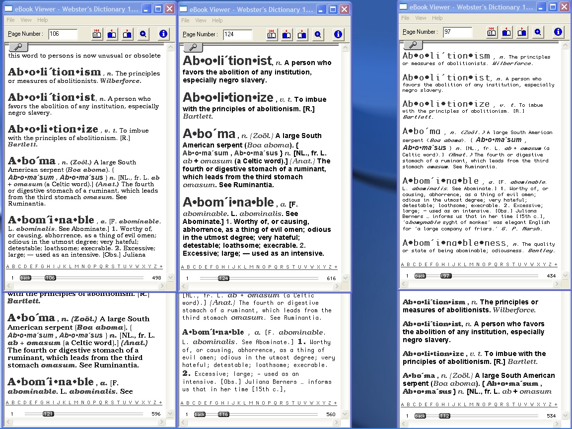 I updated my .html for this two-tier TOC already and will soon replace the ones above. Now, the exciting news (for the REB1200 version ONLY) all words referenced in a definition like 'See Base' are now hyperlinked to that entry in the dictionary; some 50,000+ new links have been added by me! Unfortunately, the EBW1150, cannot handle this many links, so I've limited the EBW1150 version to only contain hyperlinks to words that are 7 letters or greater! This reduces sufficiently the number of links and can be made to work with the EBW1150. I'm going to try increasing the number of hyperlinks i.e. only 6+ letters, then only 5+ letters, 4+ letters, etc. until I find the last working version. Again this only refers to the words referenced "inside" a definition; not the main words linked from the TOC! This conversion from .html to .imp takes siginificantly longer, about 3 hours, so it will take a bit more time to see which EBW1150 I'm going to go with. The REB1200 version is already finished! Even though this is a 100 year old dictionary, I hope you find it useful. I know some people will probably read it like a book.... ![]() p.s. I attach a teaser image of various EBW1150 .imp versions (of a sample html); the one with 596 total pages is what I will produce (small font), but I do like the one with 498 pages (x-small font). Any opinions? This work is assumed to be in the Life+70 public domain OR the copyright holder has given specific permission for distribution. Copyright laws differ throughout the world, and it may still be under copyright in some countries. Before downloading, please check your country's copyright laws. If the book is under copyright in your country, do not download or redistribute this work.