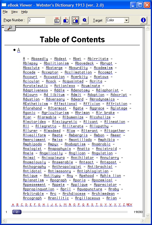 I automated the process to add TOC entries into a two-tiered TOC. I ended up adding just over 2600 TOC links. The idea was to space them evenly over every 50 words and then the mid point would be no more than 25 words from either side (word_before TOClink or word_after TOClink). With an average of (say) 5 words to a "page" that would mean the mid point would be only 5 page-turns away! Now, the exciting news (for the REB1200 version ONLY), all words referenced in a definition (i.e. Abase) like 'See Base' are now hyperlinked to that entry in the dictionary; some 50,000+ new links have been added by me! Unfortunately, the EBW1150, cannot handle this many links, so I've limited the EBW1150 version to only contain hyperlinks to words that are 7 letters or greater! This reduces sufficiently the number of links and can then be made to work with the EBW1150. I could not increase the number of hyperlinks by adding 6+ letters or less as it stopped working if I did. Again this only refers to EBW1150 version and the words referenced "inside" a definition; not the main words linked from the TOC! This conversion from .html to .imp takes siginificantly longer, about 3.5 hours! Even though this is a 100 year old dictionary, I hope you find it useful. I know some people will probably read it like a book.... ![]() BTW, did I mention IT'S HUGE. HOW TO INSTALL FOR EBW1150 users You need both parts 1 & 2 of the 'Websters Dictionary 1913.imp' zip below (the 1st & 2nd attachments below). The .html source for this ebook is included separately (the 3rd attachment below). FOR REB1200 usersNote the EBW1150 .imp ebook was produced with the 'View with Small Font Only' option so that it would work with the EBW1150's more limited memory. Also, when reading a definition and it refers to another word, the link exists only for referred words that are 7+ characters in length. This was a trade-off to allow this .imp ebook to work, as 6 character or less words just constantly rebooted the reader. Also, the first time you use a link within this .imp ebook, you may get a message that Your eBook has exhausted an internal resource... and the unit says Restarting.... Just try again as the EBW1150 just freed all available resources so as to allow the links to work now! You need both parts 1 & 2 of the 'Websters Dictionary 1913_1200.imp' zip below (the 4th & 5th attachments below). The .html source for this ebook is included separately (the 6th attachment below). Then using HJSplit or similar just combine the two parts after unzipping them i.e. .001 and .002. If you don't mind using the command prompt, type the copy command below:Aside: The REB1200 source .html can also be used with the attached wordlist (the 7th attachment below) hyperlinking all 110,875 words into the main dictionary .html. This can be used to create a new/different tier-two TOC instead of using just every 50th word! Code: