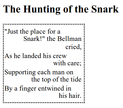 I discovered not long ago the negative indent, so you can see that my life is full of hope. ![]() I am looking on how to code this verse (screenshot) so that the last word(s) of a loong verse which have to go on a second line (with negative indent here) could be pushed to the right (see red arrows). I think it would make them more readable. The problem of course is that the paragraph is not right aligned while this (or these) words would probably have to be right aligned and that a bigger negative indent could give weird results with differents formats. Last edited by roger64; 02-09-2014 at 11:45 PM. |