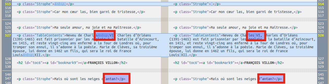 ![]() I tried the "compare" tool which is very handy. This is discovery day!! I saw what happens to   and nnbsp (see entities snapshot and red squares) and how doctype is silently killed! Utterly frightening! Last edited by roger64; 02-19-2014 at 04:15 AM. |