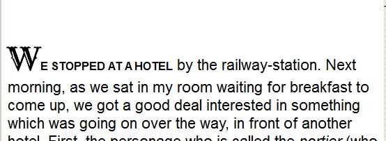 Her difficulty lies with the fact that she would have picked an image--a Cap--based on her desired, embedded font, generally speaking. A Raised Initial that goes with, say...Open Sans, just for giggles, won't look very spiffy with Times New Roman, or, say, Trebuchet. So, she has two challenges, given her view on the Paperwhite--how to get people to make the extra effort to see the font she wants them to see, and ensuring that her Raised Initial "matches" whatever font they select. It wouldn't be that simple to find an elegant Raised Initial to match all possible Paperwhite fonts. This is why--as elegant and lovely as your solution is--using an actual letter works better, in the sense that you don't have to worry that your imaged Raised Initial matches ALL the possible fonts. THAT is the "issue." See what I mean? Your solution really is quite nice, don't misunderstand me. It's just a bit of a challenge when she has no control over the PPW. On the other devices, she can reasonably expect the user to see her embedded fonts. Not so on the Paperwhite. It's a challenge that affects us all. Her real answer is simply to live with the leading, like everyone else does. Hitch |