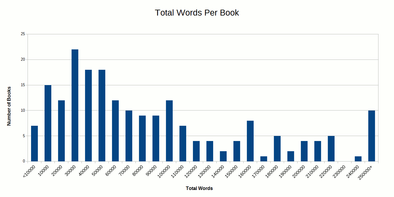I liberated 18,172,166 words from PDF -> EPUB since October 2012. (Although I haven't updated the stats in about a month). ![]() And EPUBs that I read for pleasure + cleaned as I went along, 2,870,128 words. I will have to go through and add in a Page Count to all of the books as well... that might also lead to some decent stats/graphs. (Although in my opinion, pages are a horrible way to measure. A page of non-fiction =/= a page of fiction =/= a page out of a journal/newspaper =/= a page in different font/font-size/margins). And how would you go about handling measuring "Pages" of text from an HTML source? Quote: