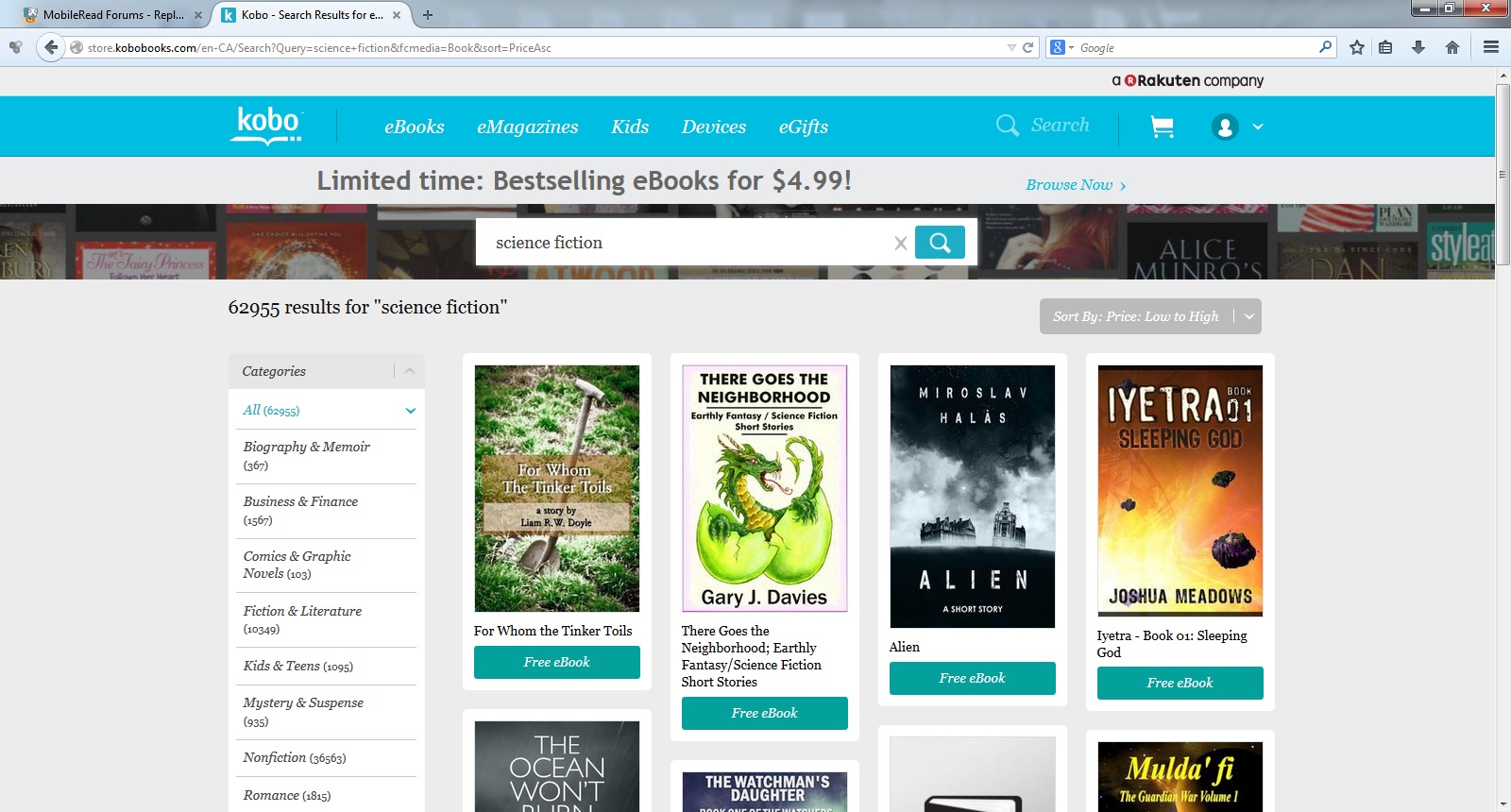 The thing is that although these books do show in the store when browsing my computer, in the Kobo store of the device itself there doesn't seem to be an option to filter books by price, let alone free books. Does anyone know of any way to do this? Thanks |