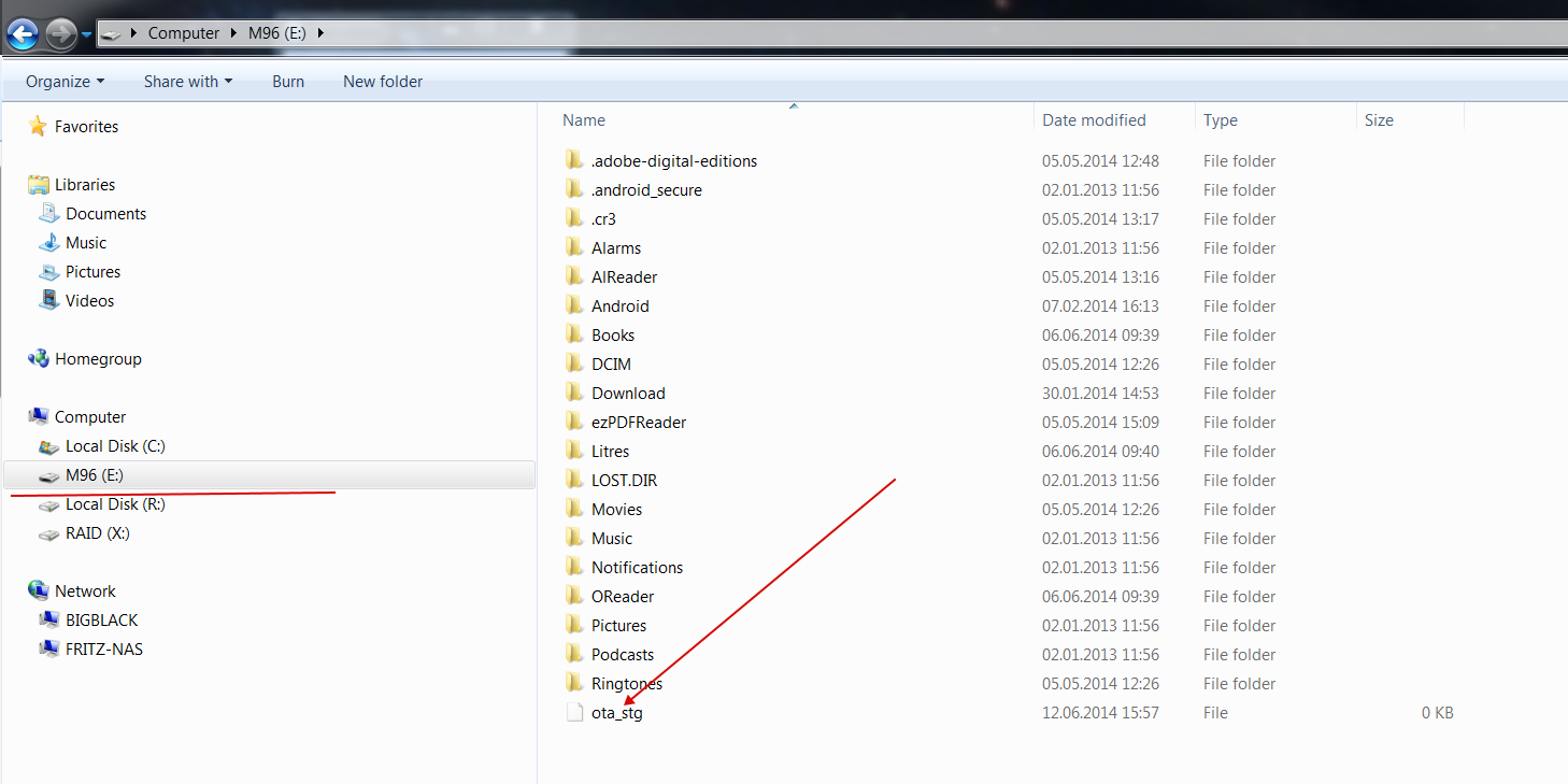 E.g. create a new txt file on your PC (New Text Document.txt). Rename it to ota_stg (without file extension). Copy that file in your M96 (root folder) like in attached screen shot Afterwards just do like in my description above. Last edited by Booxtor; 06-13-2014 at 07:19 AM. |