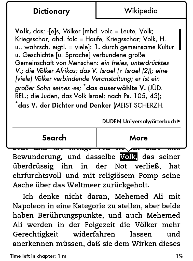 Just to be absolutely clear, though (and I know you imply this in your post, but I wanted to spell it out - no pun intended), the Kindle comes as standard with a (very good) monolingual German dictionary, but not with a translation dictionary. If you want a translation dictionary, you have to buy one (or find a free one, but that's probably not going to be anything like as good as a commercial dictionary).
