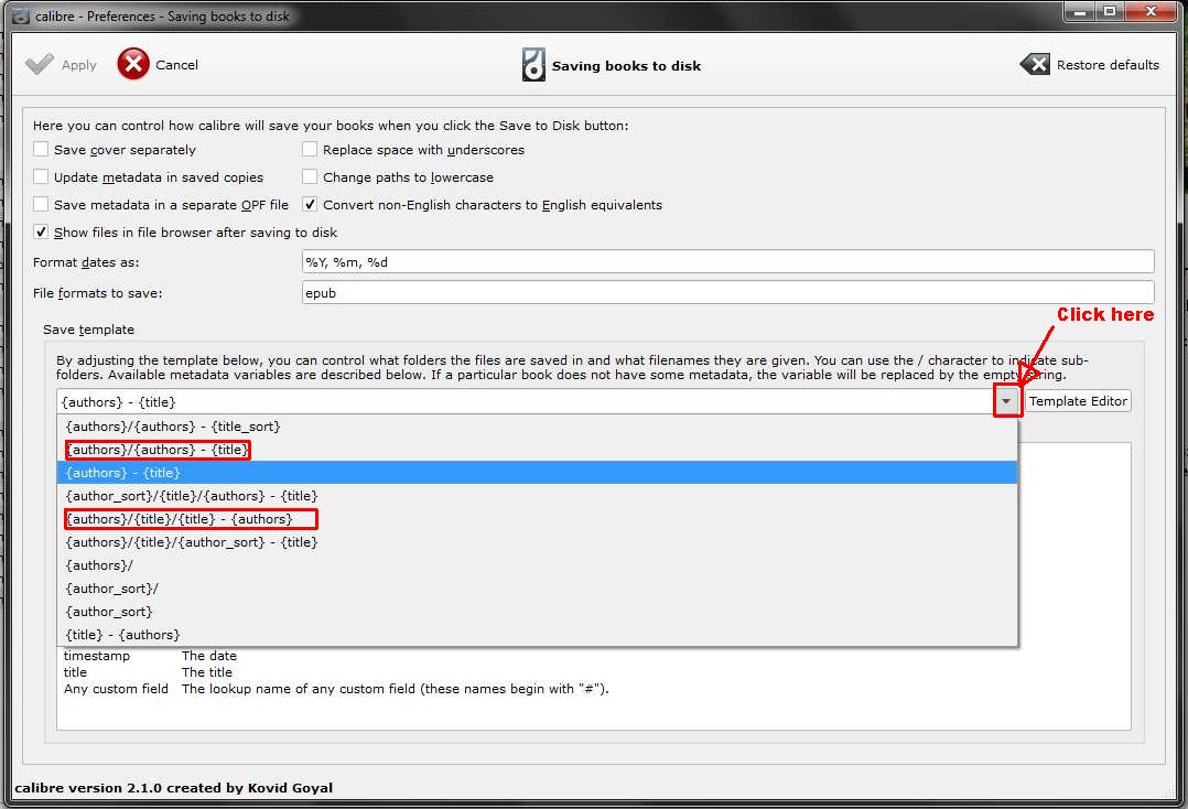 If not then if you tell us precisely what you want we might be able to furnish you with the template. But, if you can create the template yourself, by building on the 'samples' provided, together with the list of variables you see there, then you will learn the basics of 'templates', which are widely used elsewhere in calibre. BR Last edited by BetterRed; 09-01-2014 at 01:39 AM. Reason: clarity |