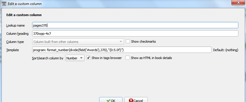 ORIGINAL POST: I've looked through this info. I've managed with some of it, but this part is beyond me right now. I think I can handle making the column, but I need the FUNCTION string to make it work. My goal is do a math problem using 1 existing custom column. I have these 2 columns: #pages and #words These are populated by the Count Pages plug-in. However, #pages uses characters to determine the number of pages. I want to be be able to relate to the digital book better based on traditional formatting of printed non-educational and non-art books sized between 5.5in to 6"x9" in English. I've researched many "facts" and opinions on the average number of words per pages in these traditional printed formats. I've settle on using 300 words per page as my number to determine a page count I can relate to. I'm already familiar with personal reading speed and can relate that to word count, but this would be a really nice feature if someone can help make it happen. It could also be really helpful to self-publishers. Essentially, I need a column that does this math: #words/300 and returns the numeric value rounded up if possible. Can anyone construct this string for my custom column? Last edited by jecilop; 09-02-2014 at 03:15 AM. Reason: Update |